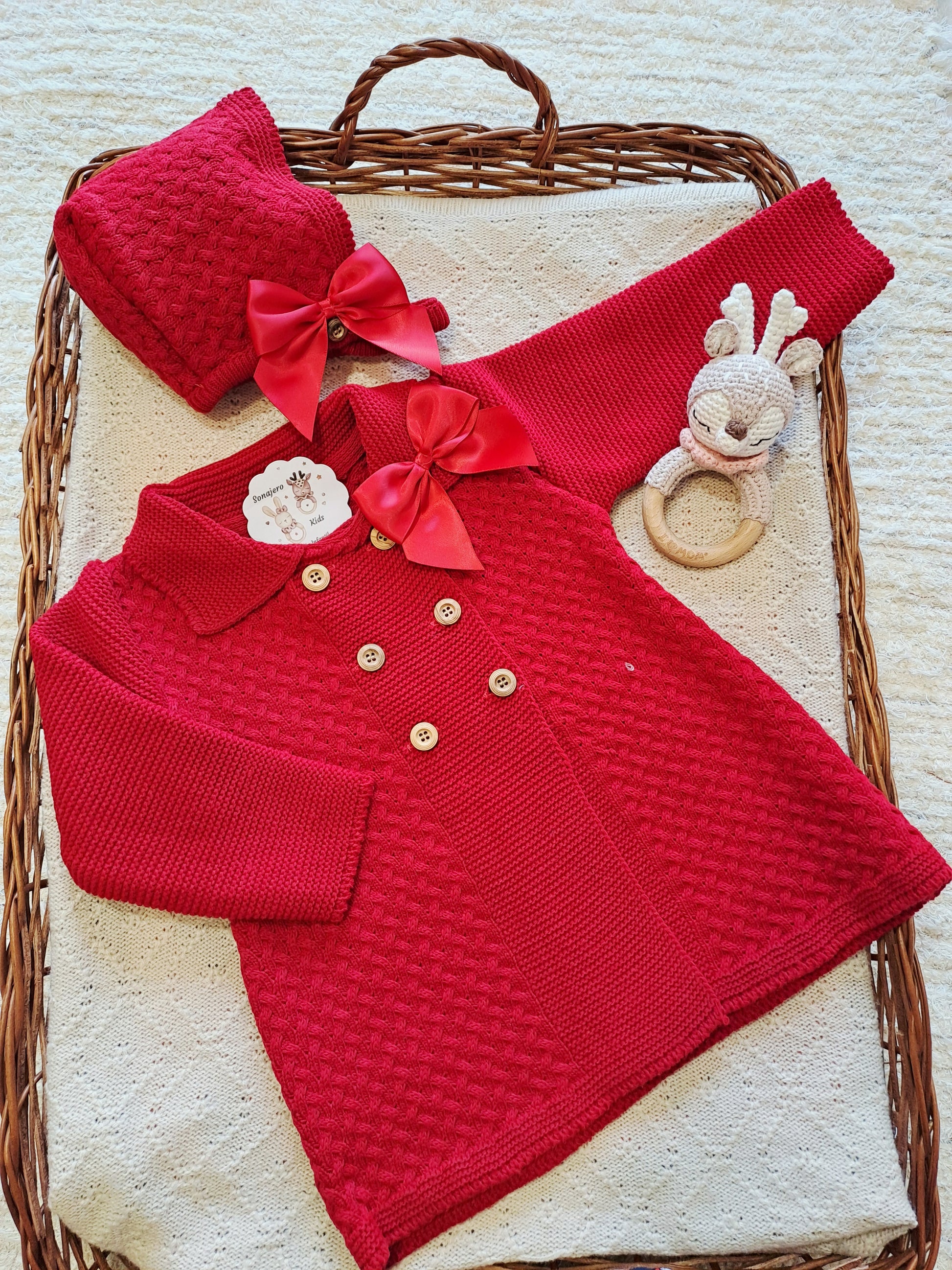 conjunto de punto para bebé en color rojo, ideal para un estilo clásico y dulce. La pieza principal es una chaqueta o rebeca de manga larga, con un diseño cruzado y cierre de doble botonadura con botones de madera de tonalidad clara. Presenta un cuello tipo solapa con lazo y un patrón de punto liso que le añade textura y detalle. El bajo de la chaqueta tiene un borde festoneado sutil.