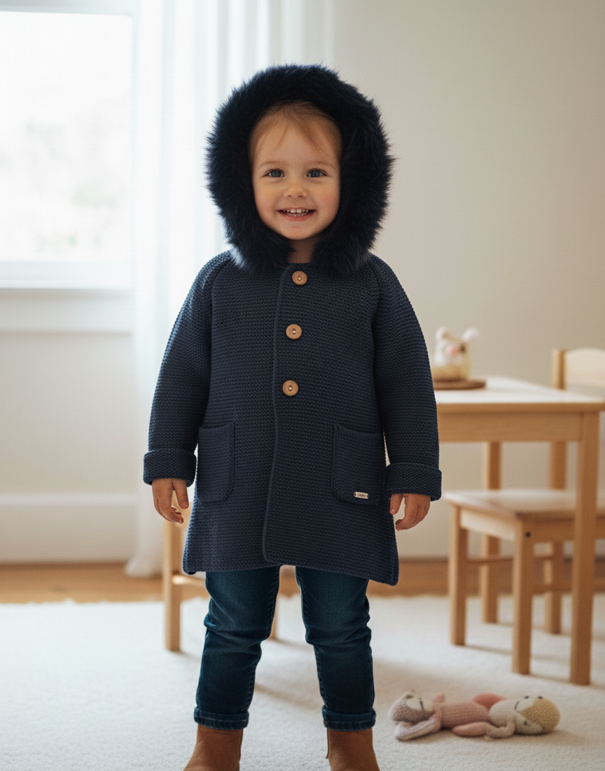 Es un abrigo pensado para bebé o niño pequeño, con un estilo clásico y elegante.