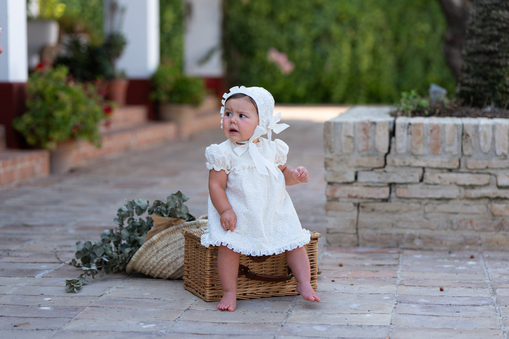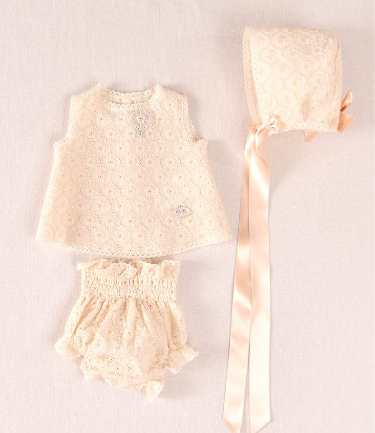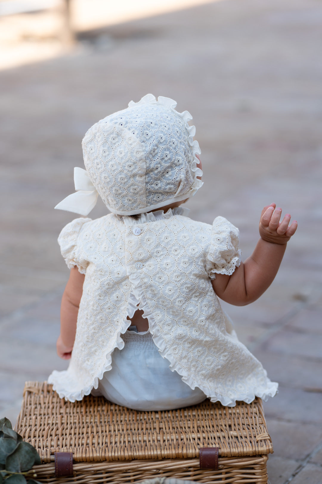 Tiene un vuelo fruncido que enmarca la cara del bebé y se ajusta mediante una lazada de cinta de falla o raso en color crema bajo la barbilla.
