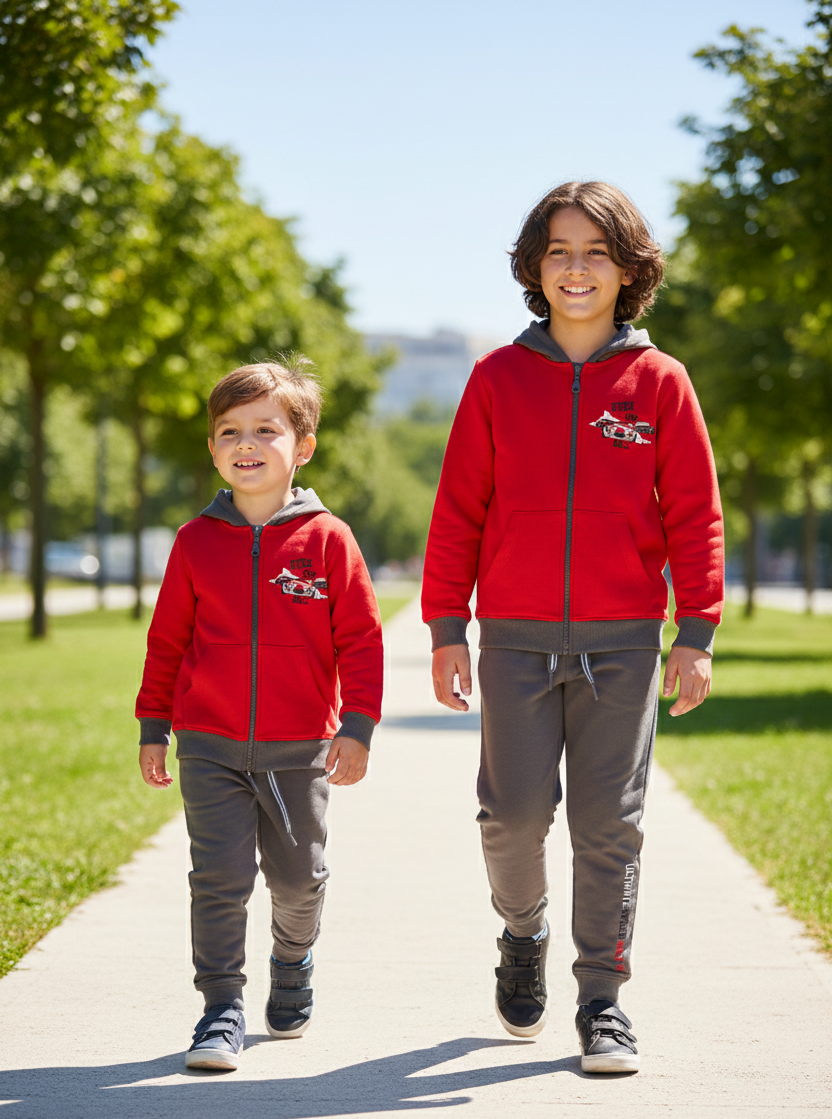 Conjunto para niño en color rojo y gris. Este dinámico conjunto incluye una sudadera con capucha en color rojo vibrante, adornada con un estampado de coche de carreras en el pecho. La sudadera, con su diseño de cremallera frontal y puños en contraste, está confeccionada en un tejido suave y cálido, proporcionando una capa adicional de comodidad y estilo para los días más frescos. El conjunto se completa con un pantalón gris a juego, diseñado para ofrecer un ajuste cómodo y una gran libertad de movimiento gracias a su cintura elástica y sus puños ajustados. El pantalón presenta un detalle de texto en la pernera, añadiendo un toque moderno y deportivo al conjunto. Haz que tu hijo luzca moderno y lleno de energía con este conjunto en rojo y gris, una combinación que ofrece estilo y funcionalidad. Perfecto para cualquier ocasión, este conjunto es fácil de lavar y mantener, ideal para el uso diario. Disponible en tallas para niños de 2 a 16 años, añade este conjunto a la colección de tu hijo y dale un look lleno de diversión y color.