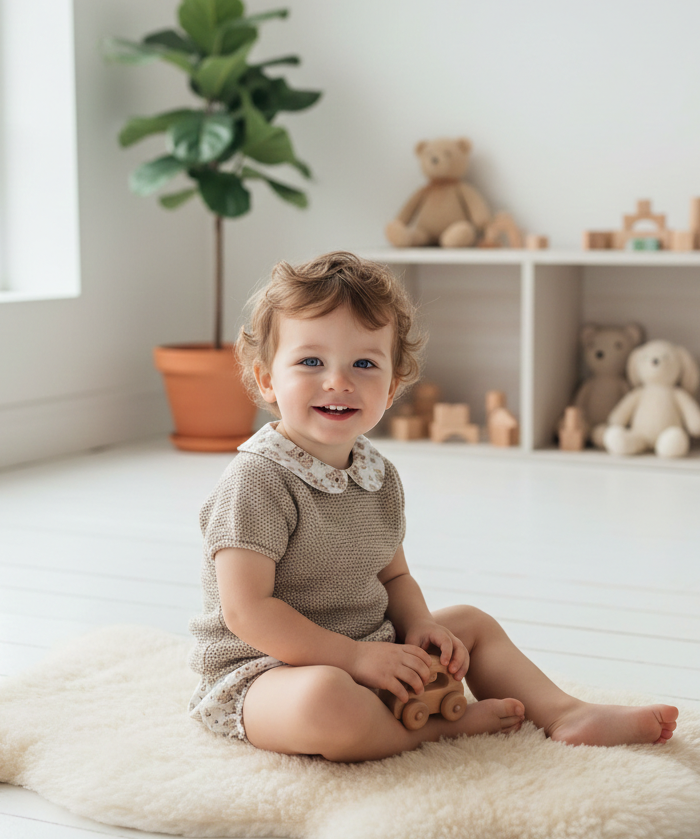 Conjunto de Punto y Estampado Botánico Un diseño lleno de ternura que combina la calidez del punto artesanal en tono piedra con la delicadeza de un estampado floral suave. El detalle del cuello bebé y los bombachos a juego crean un look clásico, cómodo y perfecto para ocasiones especiales o paseos inolvidables.