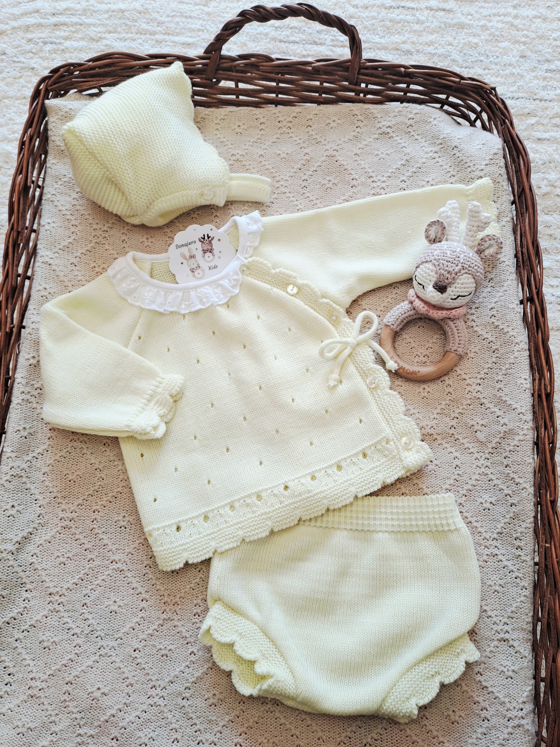 Conjunto lana de 3 piezas, de punto celeste, capota pololo jersey