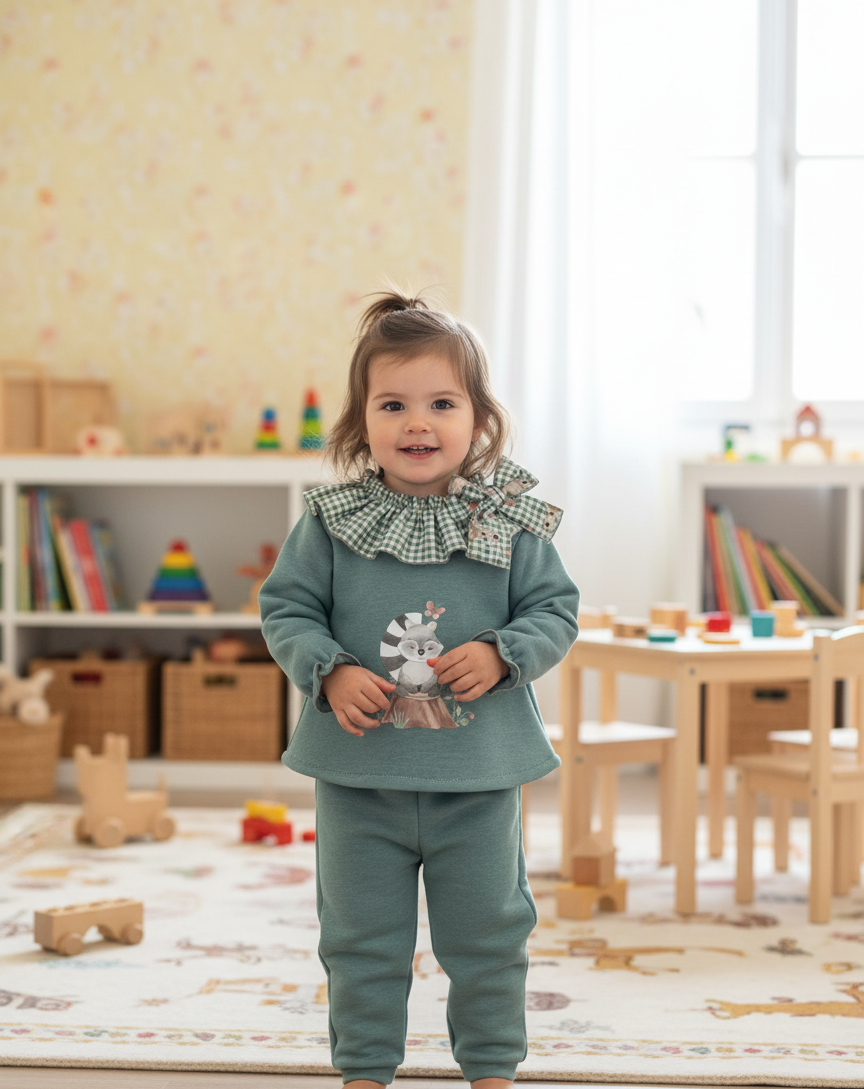 El conjunto infantil de sudadera, camiseta y pantalón 3 piezas de algodón color verde palido con un diseño clásico con estampado de un mapache y volante en el cuerpo con lazo , confeccionado en un material suave y cálido.