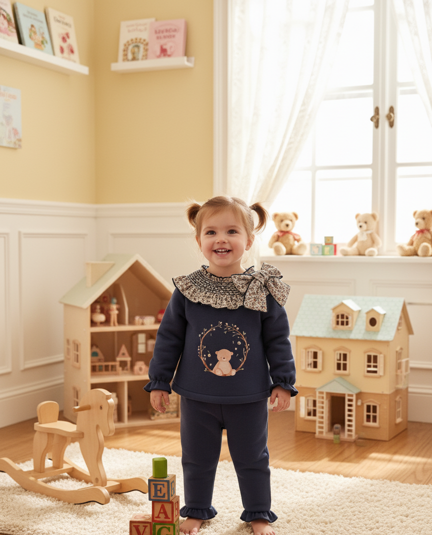 El conjunto infantil de sudadera, camiseta y pantalón 3 piezas de algodón color marino con un diseño clásico con estampado de oso y volante en el cuerpo con lazo , confeccionado en un material suave y cálido.