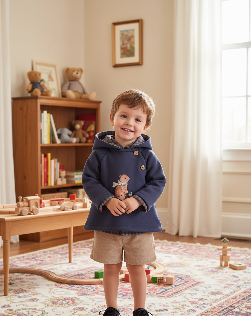 Conjunto de sudadera jogging con capucha y estampación + camisa Vichy + Pantalón en micropana forrado ( 3 Piezas ) un diseño clásico con estampado de oso en bici, confeccionado en un material suave y cálido.