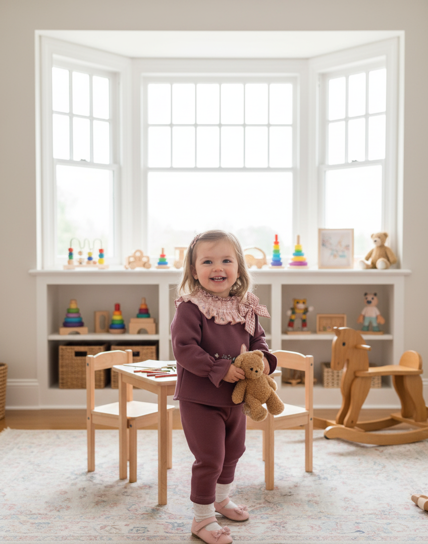 El conjunto infantil de sudadera, camiseta y pantalón 3 piezas de algodón color bugambilla con un diseño clásico con estampado de conejita con carro y volante en el cuerpo con lazo , confeccionado en un material suave y cálido.