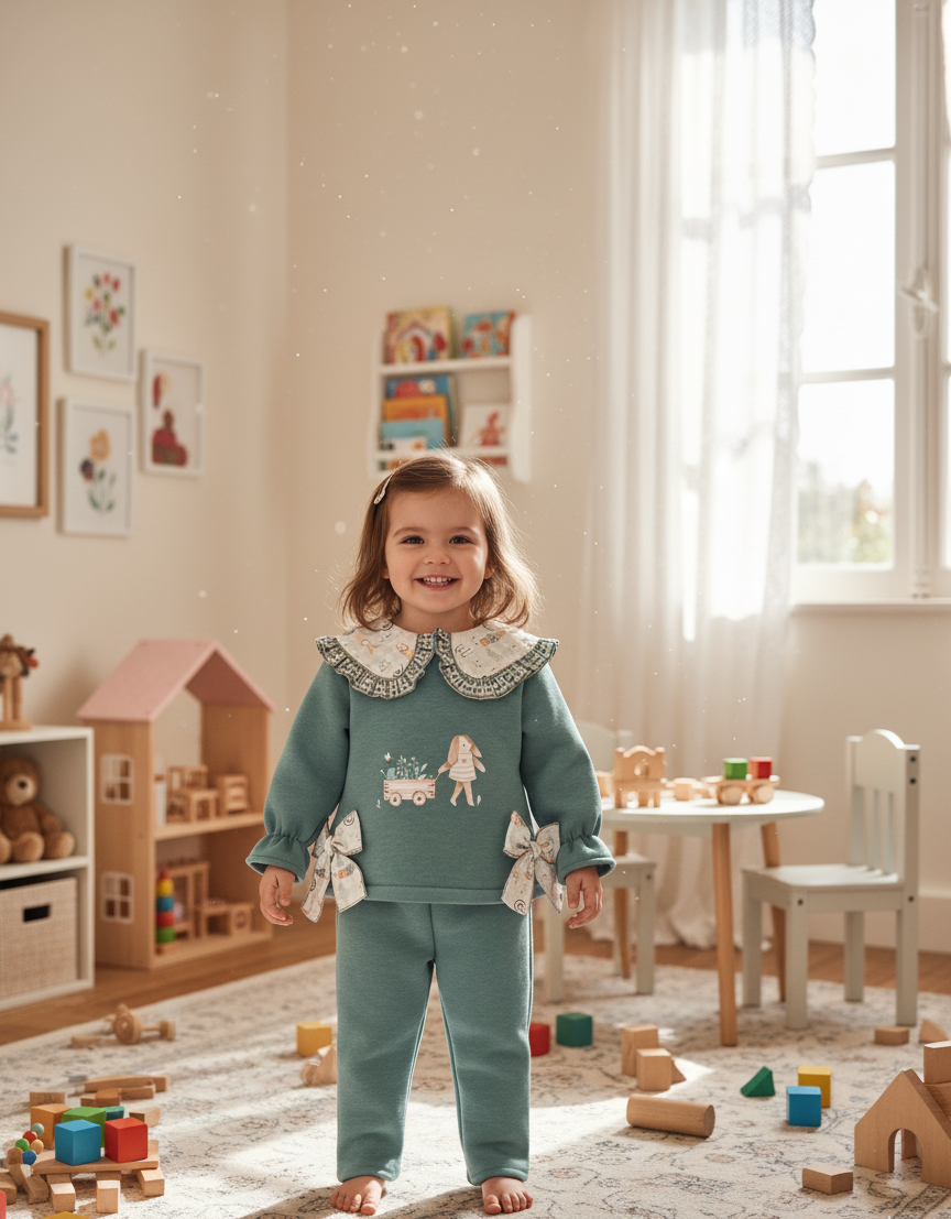 El conjunto infantil de sudadera, camiseta y pantalón 3 piezas de algodón color verde palido con un diseño clásico con estampado de conejita con carro y volante en el cuerpo con lazo , confeccionado en un material suave y cálido.