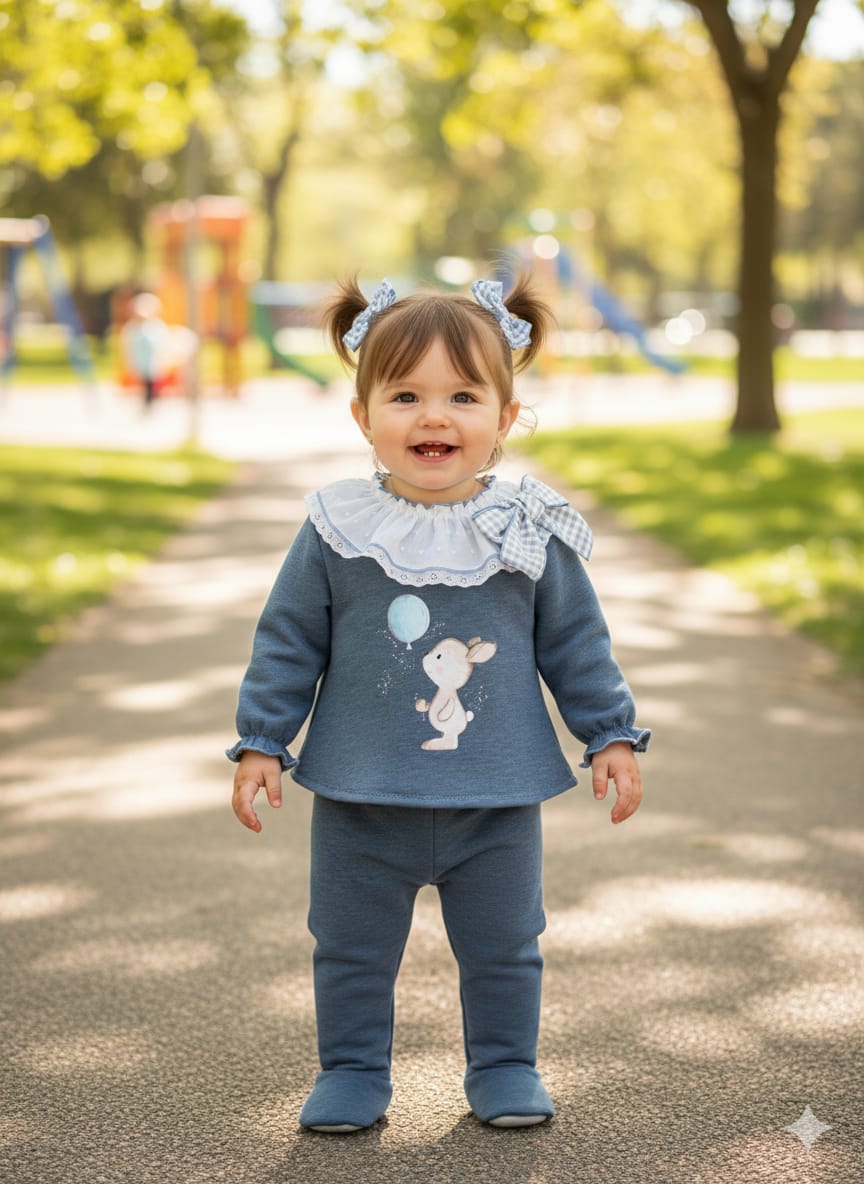 El conjunto infantil de sudadera, camiseta y pantalón 3 piezas de algodón color azul con un diseño clásico con estampado de conejito con globo de corazón y volante en el cuerpo con lazo la camiseta blanca con remate en rosa en el filo del volante, confeccionado en un material suave y cálido.