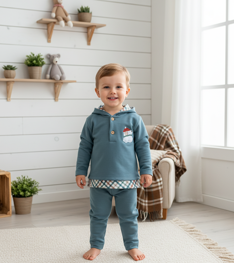 Este encantador conjunto para niño, ideal para los días frescos, combina comodidad y ternura en un diseño único. Incluye una sudadera azul con capucha forrada en tela a cuadros multicolor y decorada con un tierno bordado de un perrito con gorro rojo de invierno. El detalle de botones en el pecho y el dobladillo con estampado a cuadros aportan un toque clásico y acogedor. El pantalón a juego, en el mismo tono azul, completa este conjunto perfecto para aventuras invernales con estilo y calidez. Ideal para usar en salidas casuales o días especiales en familia.