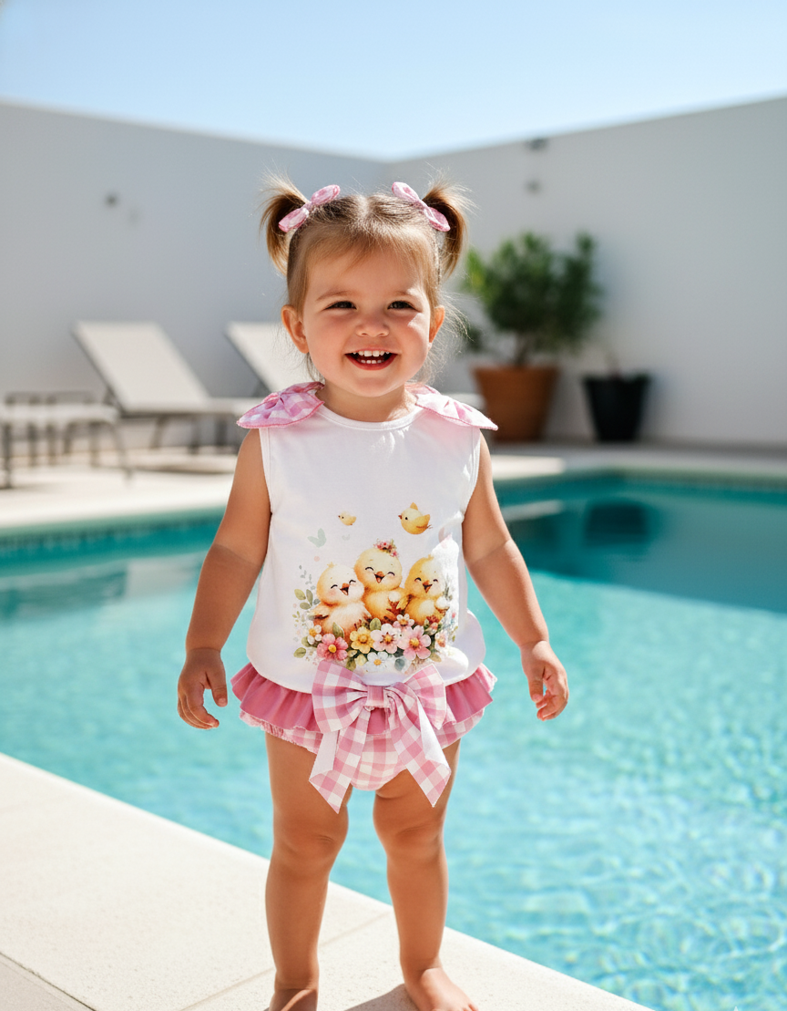 Conjunto camiseta algodón y braguita bañador con volante y lacito en el centro 💚