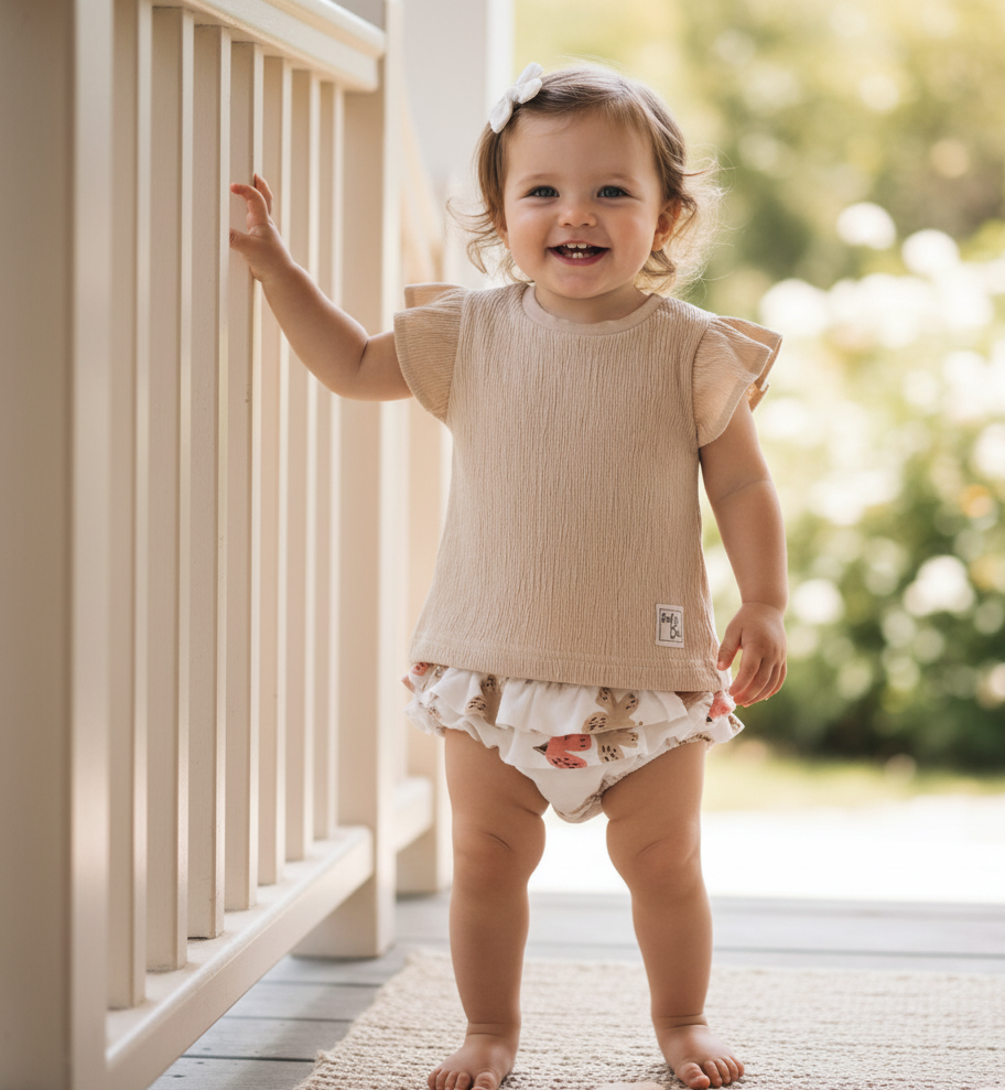 💚Camiseta de bambula beige con braguita crema con pajaritos 💚