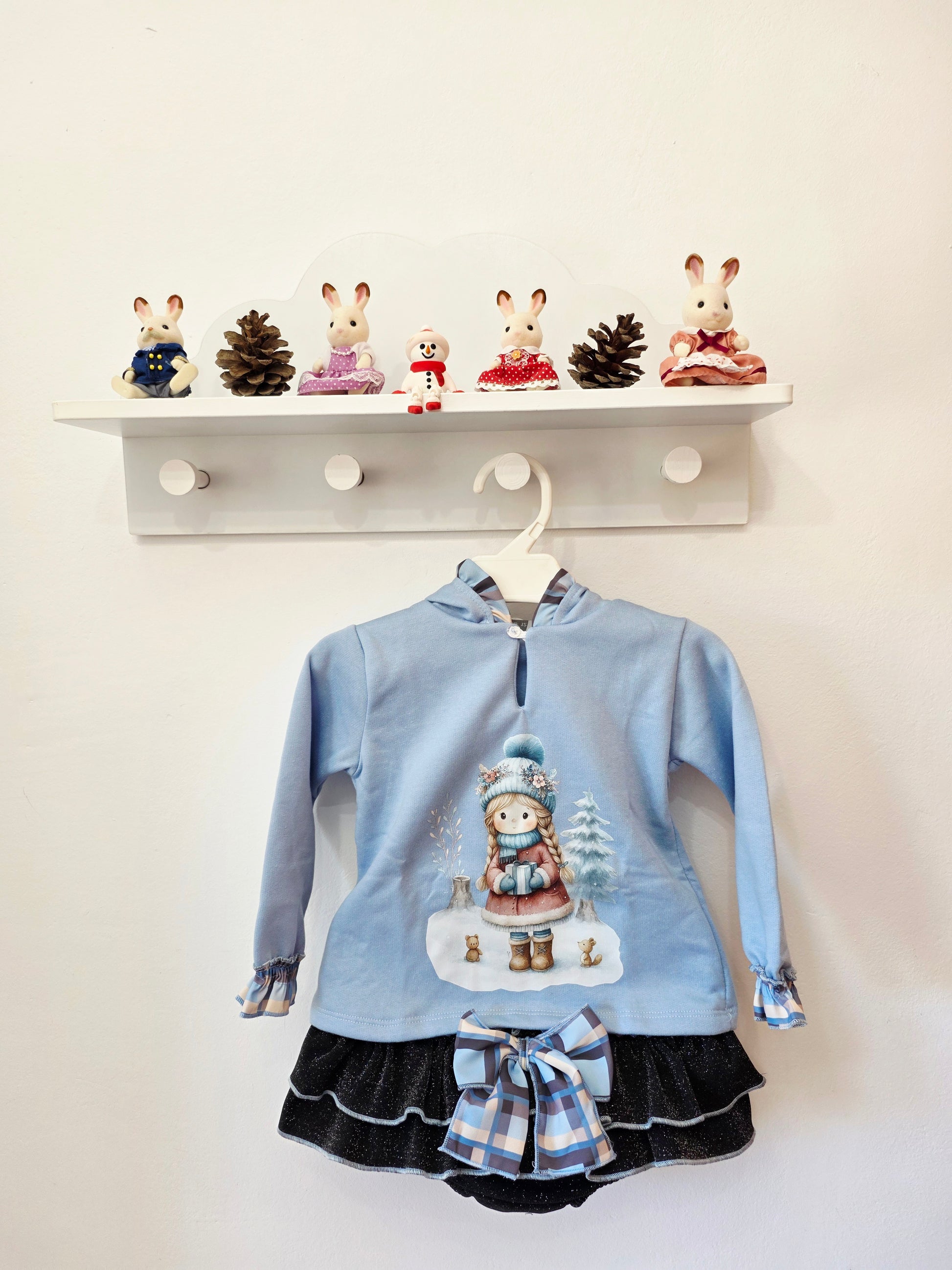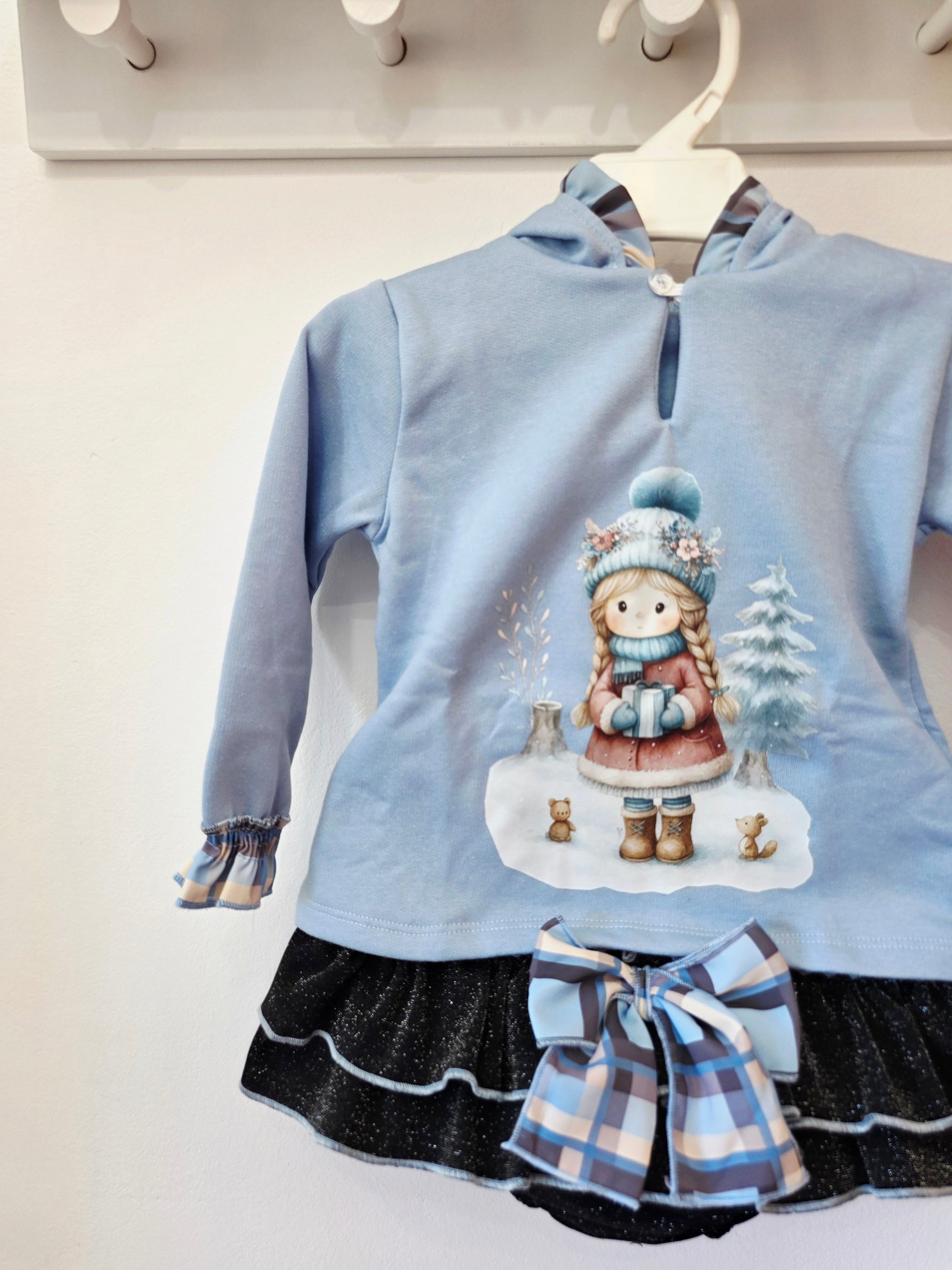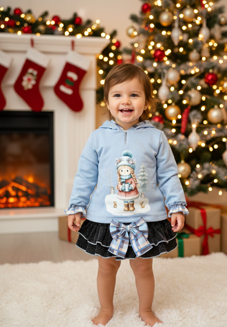 Sudadera: Es de color azul claro y tiene una capucha. El detalle más destacado es un gran estampado central de una niña vestida con ropa de invierno (gorro, bufanda) sosteniendo un regalo, junto a un árbol de Navidad nevado. La sudadera parece tener un pequeño volante o ribete en los puños.