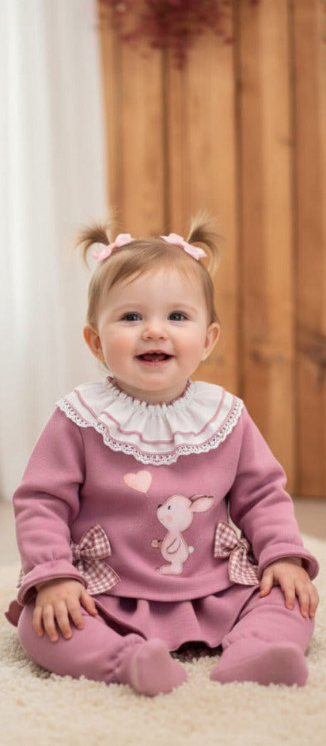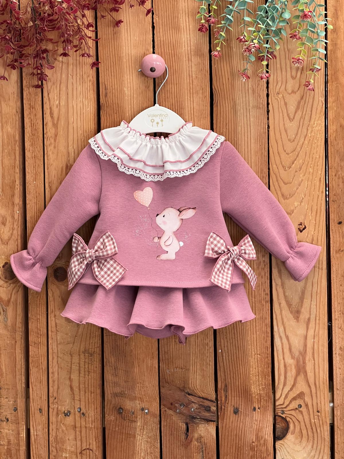 El conjunto infantil de sudadera, camiseta y braguita 3 piezas de algodón color buganvilia con un diseño clásico con estampado de conejito con globo de corazón y volante en el cuerpo con lazo la camiseta blanca con remate en rosa en el filo del volante, confeccionado en un material suave y cálido.