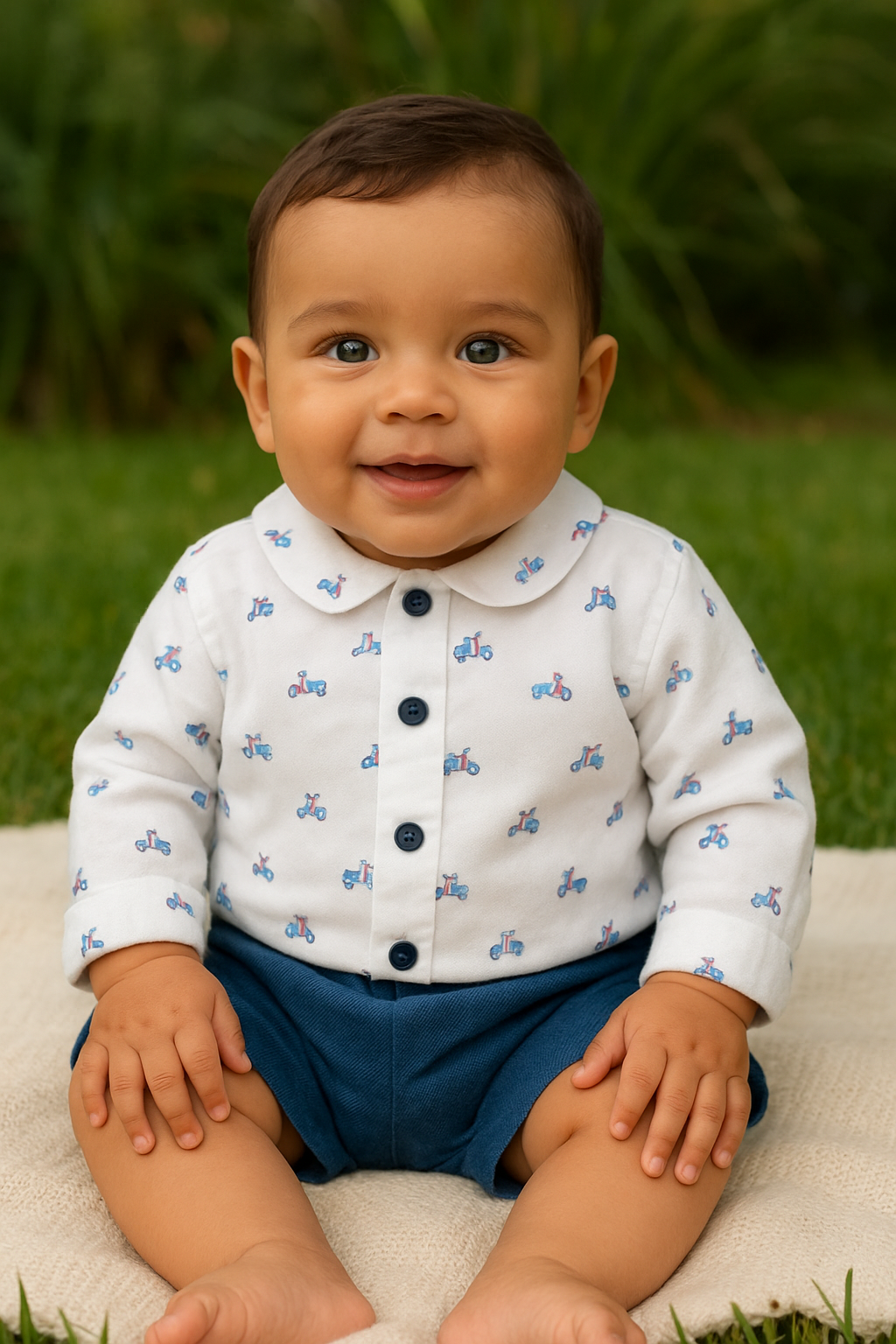 Conjunto de camisa con bespitas estampados y pantalón azul
