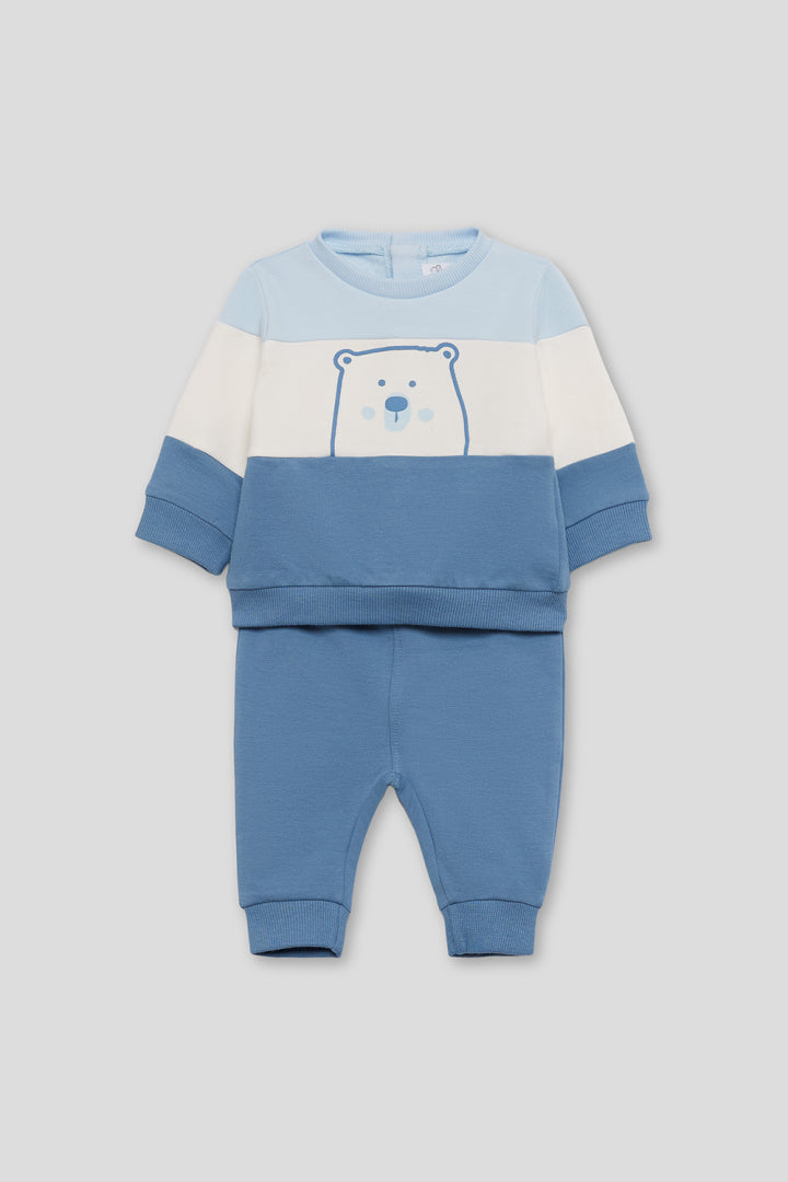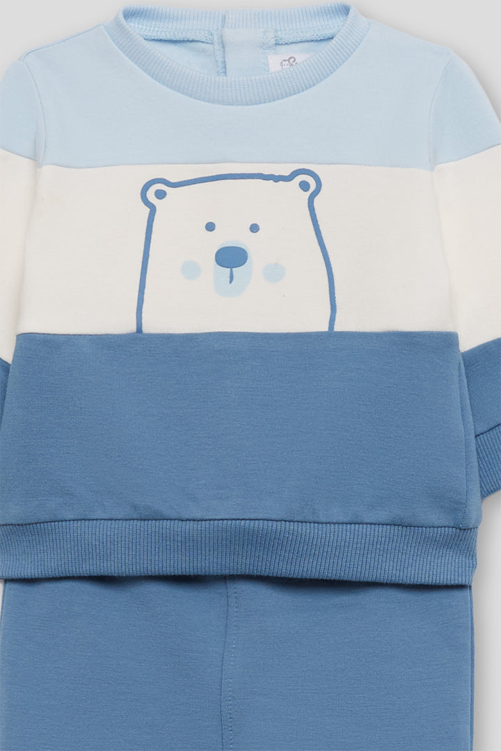 Confeccionado en felpa perchada, este conjunto incluye una sudadera en bloques de color azulina, blanco y celeste, con un simpático estampado de oso polar en el centro. El diseño presenta cuello redondo, manga larga y cierre trasero con automáticos para facilitar la puesta. El pantalón largo, en azulina a juego, cuenta con cinturilla elástica y bajos con puño para mayor comodidad.