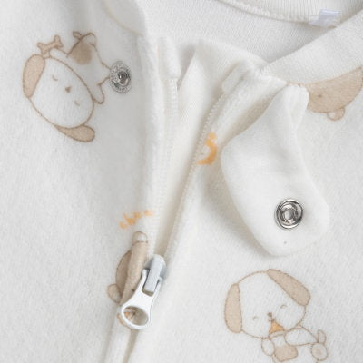 Pelele de manga larga con pies cubiertos, confeccionado en suave algodón blanco ideal para la piel delicada del bebé. Presenta un práctico cierre frontal con cremallera que va desde el cuello hasta el pie, facilitando el cambio de ropa. En la parte superior, incluye un broche de seguridad que cubre la cremallera para mayor comodidad.