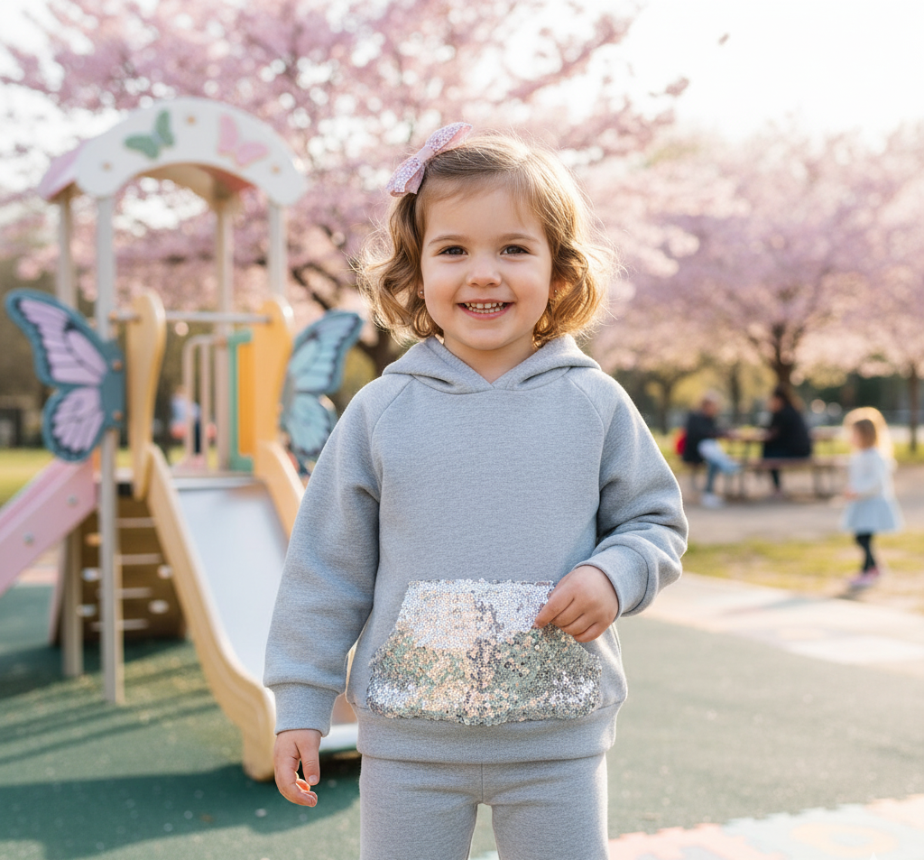 Bolsillo tipo canguro al frente, decorado con lentejuelas plateadas brillantes que aportan un toque llamativo y divertido.