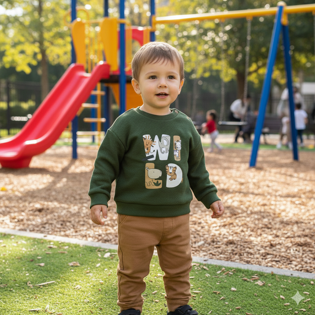 Diseño: Presenta la palabra "WILD" en el frente, con cada letra decorada con ilustraciones de animales salvajes (como un león, un tigre, una cebra y un hipopótamo), lo que le da un toque lúdico y encantador.