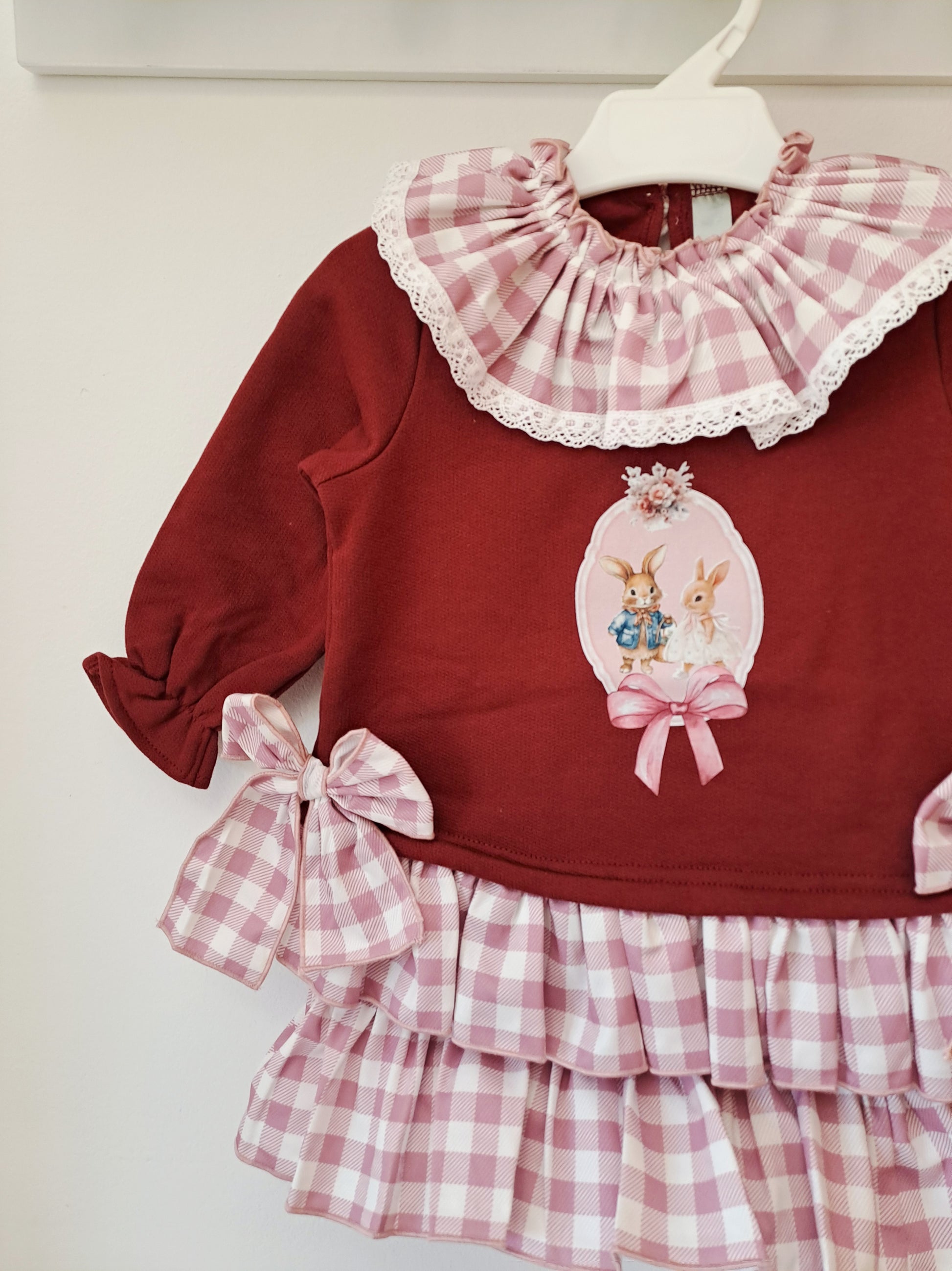 Este adorable conjunto infantil combina un estilo romántico y campestre. La parte superior, en tono burdeos, tiene manga larga y un delicado cuello volanteado en estampado vichy rosa y blanco con ribete de encaje blanco. En el centro luce un tierno estampado de dos conejitos enmarcados en un óvalo con un pequeño lazo decorativo, aportando un toque dulce y nostálgico.