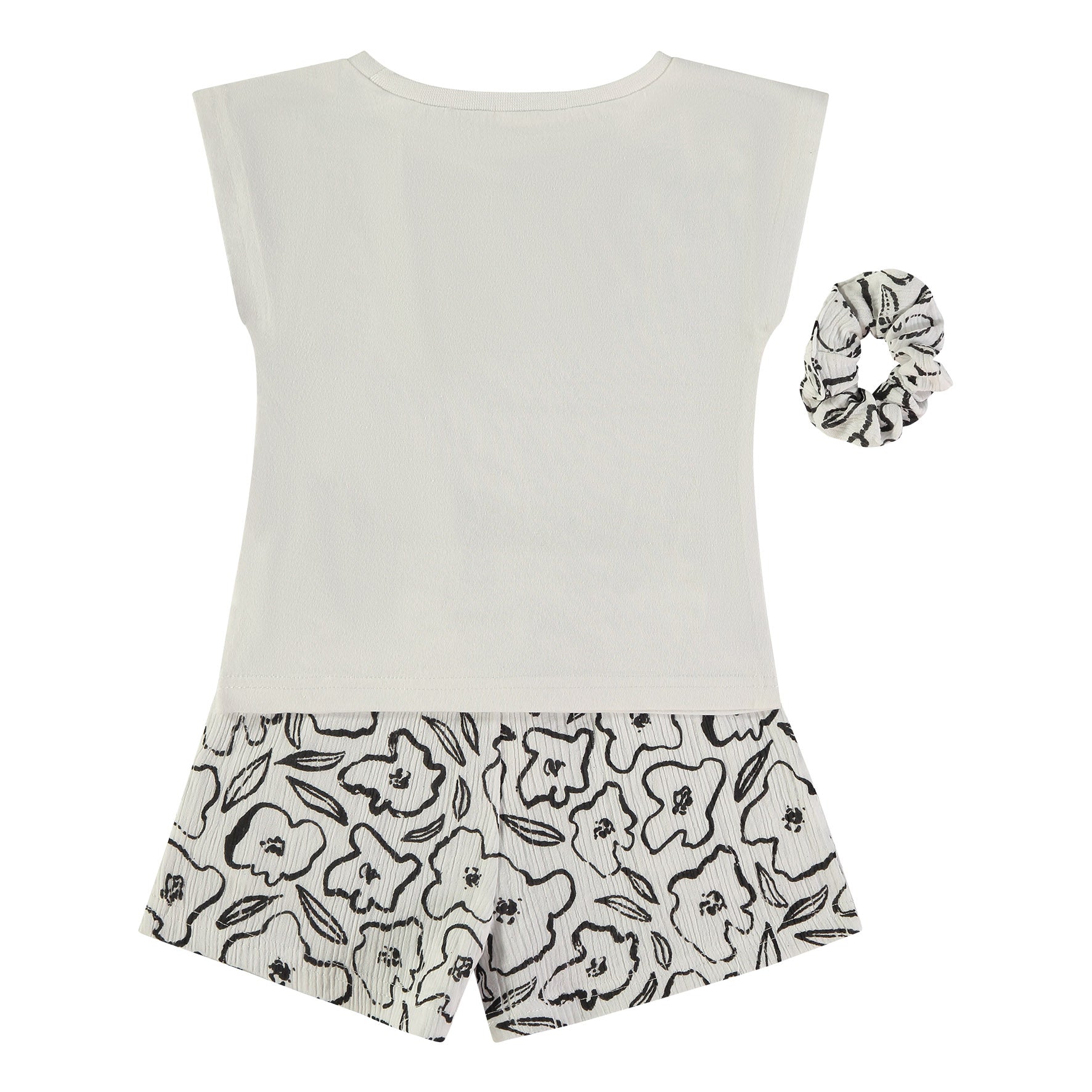 Conjunto Contraste Comodidad y estilo en una sola pieza. Este set de dos piezas destaca por su diseño minimalista de flores en contraste negro sobre blanco. Con un corte relajado y tejido ligero, es la opción perfecta para que las más pequeñas disfruten del sol con un toque artístico y chic. Incluye coletero a juego.