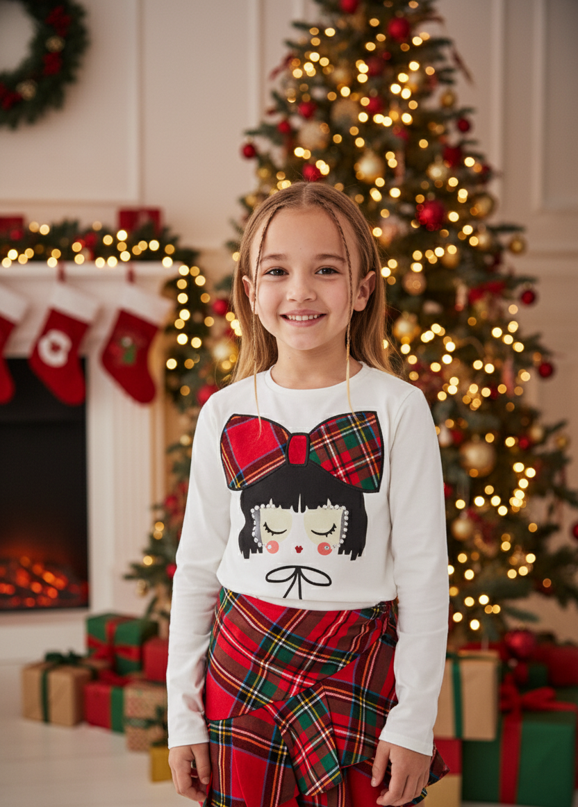 Camiseta para niña en color crudo. Esta encantadora camiseta presenta un diseño único con un estampado de cara adornada con un lazo de cuadros en tonos rojos y verdes, junto con detalles de pedrería alrededor de los ojos, lo que le añade un toque de originalidad y brillo. Confeccionada en un tejido suave y cómodo, es ideal para el uso diario, ofreciendo estilo y comodidad. La camiseta cuenta con mangas largas y un cuello redondo, proporcionando un ajuste cómodo y seguro. Su diseño versátil permite combinarla fácilmente con diferentes tipos de pantalones, faldas o leggings, creando looks variados y modernos. Perfecta para cualquier ocasión, ya sea para actividades cotidianas, momentos de juego o una salida casual, esta camiseta es una adición imprescindible al guardarropa de cualquier niña. Es una opción práctica y encantadora para cualquier ocasión.