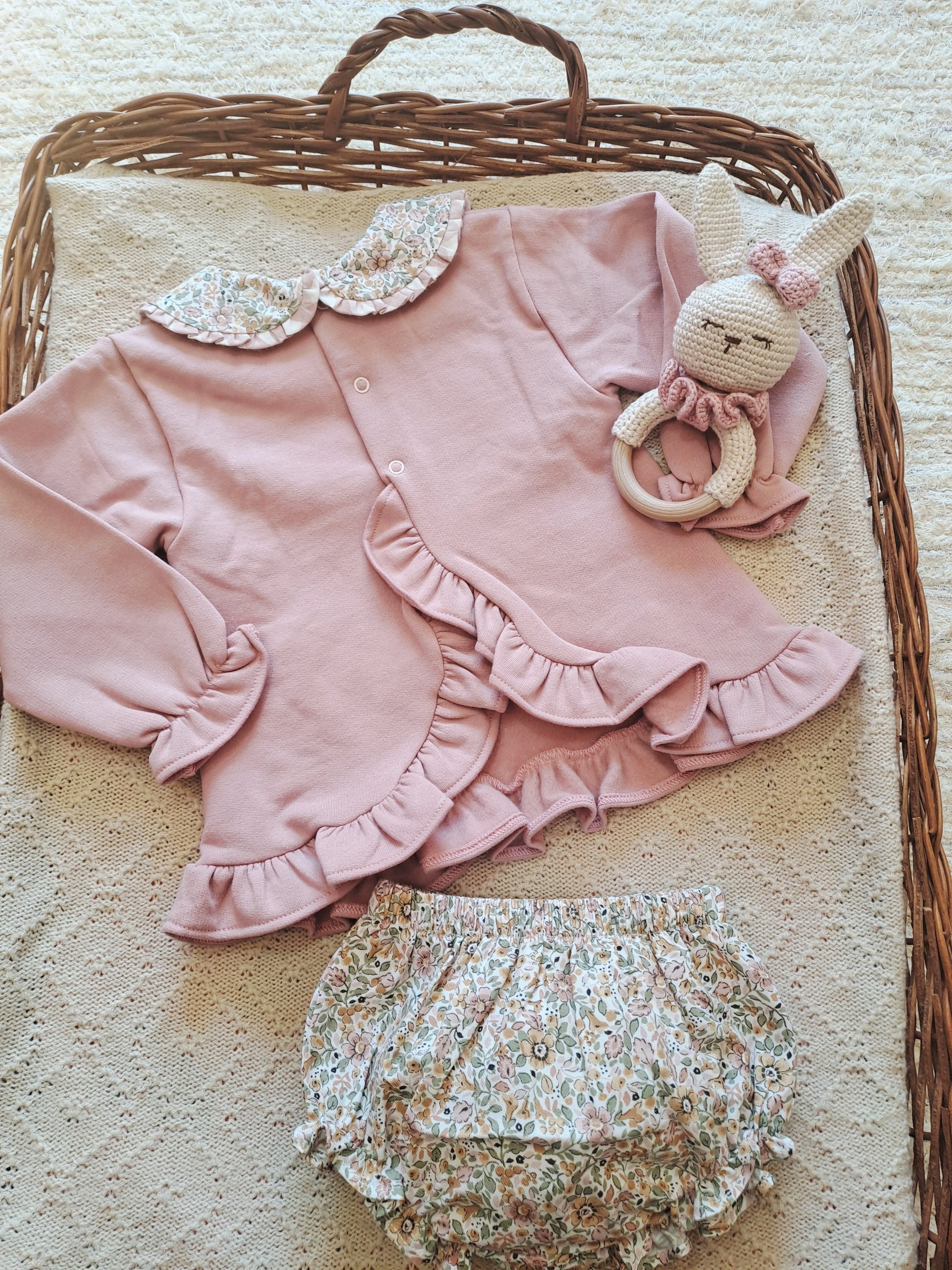 Sudadera: De color rosa empolvado, confeccionada en un tejido suave, con mangas largas y puños ligeramente fruncidos. El detalle más destacado es el gran cuello tipo babero con estampado floral en tonos pastel (rosas, verdes, beige y blancos), rematado con un delicado volante plisado blanco. En la parte trasera, la blusa se cierra con prácticos broches a presión para facilitar el cambio de ropa.