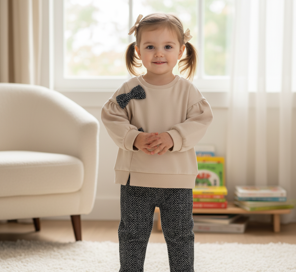 Conjunto infantil elegante compuesto por sudadera color crema con dos moños negros en relieve y pantalón estampado en patrón espiga en tonos oscuros. Un look cómodo y sofisticado ideal para ocasiones especiales o para lucir con estilo en el día a día.
