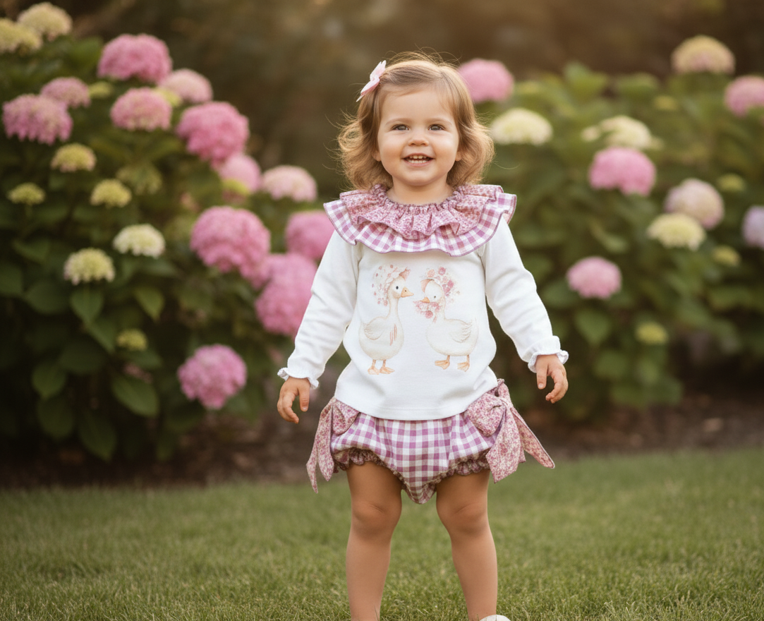 El conjunto combina la sencillez del blanco con la dulzura del estampado Vichy y el encanto del motivo de patitos, resultando en una prenda clásica, muy femenina y de alta calidad para una niña pequeña.
