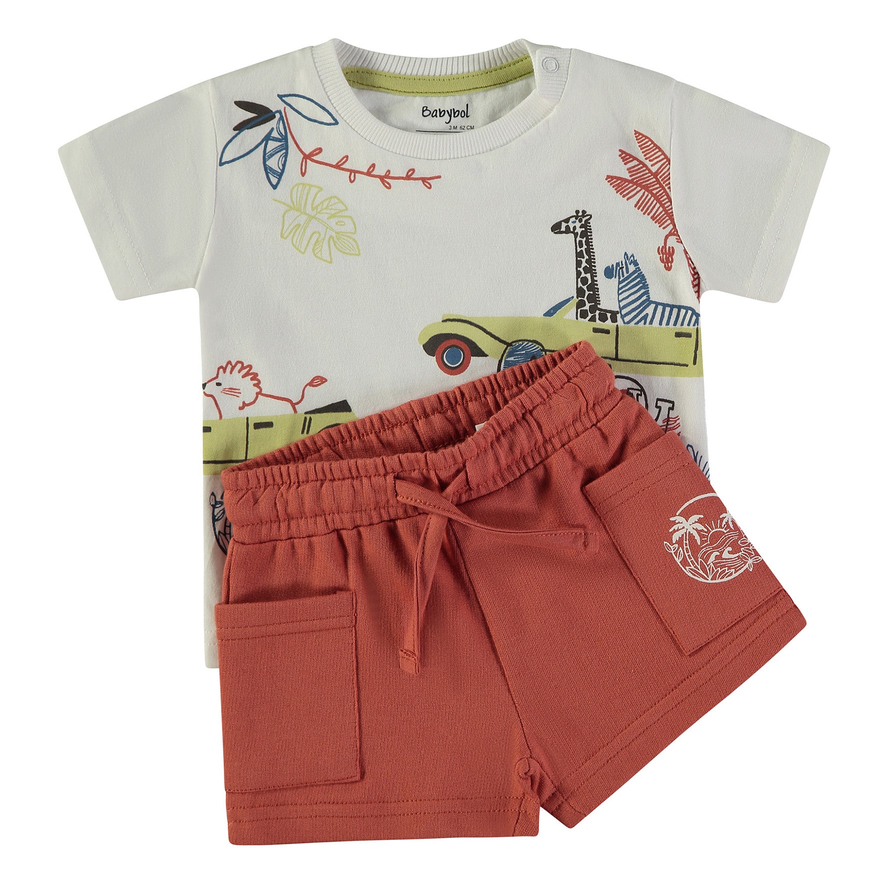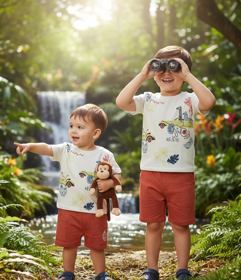 Conjunto Explorer: Estampado Safari & Confort ¡Listos para la aventura! Este conjunto de dos piezas combina una camiseta con un divertido gráfico de safari y unos shorts en tono terracota súper resistentes. Fabricado en algodón suave, es la opción perfecta para que los pequeños exploradores se muevan con total libertad.