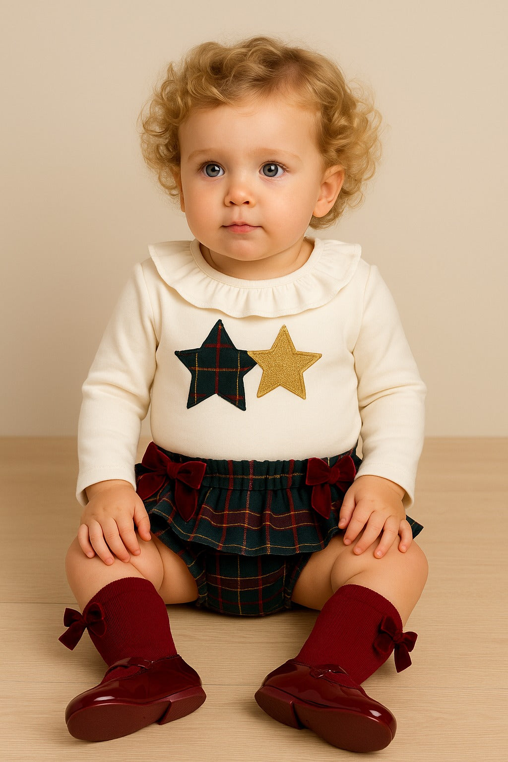 Conjunto de algodón en blanco roto con volantes en los hombros con volante de cuadros vichi en blanco y azul , bordado de estrellas, braguita de cuadros vichi con goma en la cintura y en las piernas.