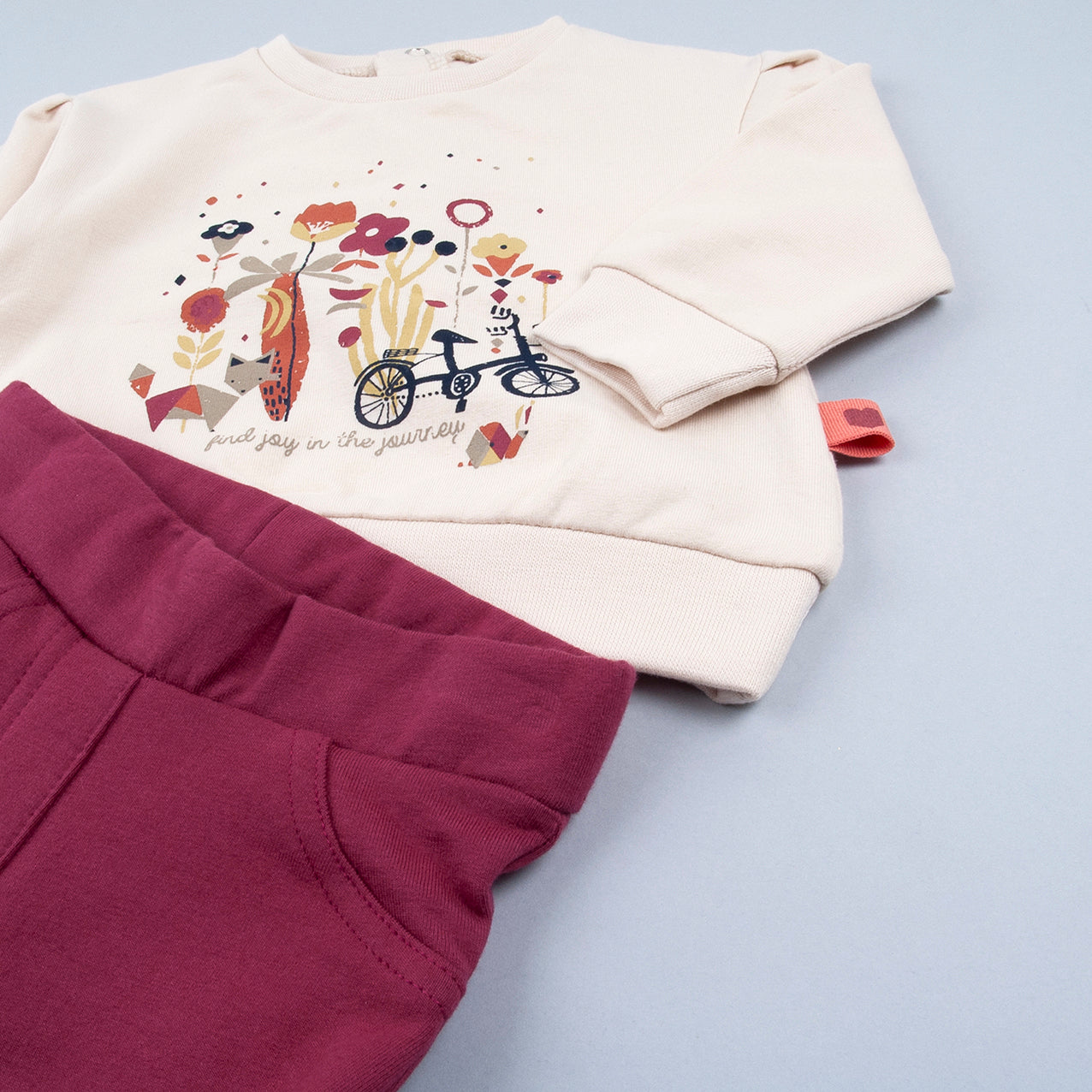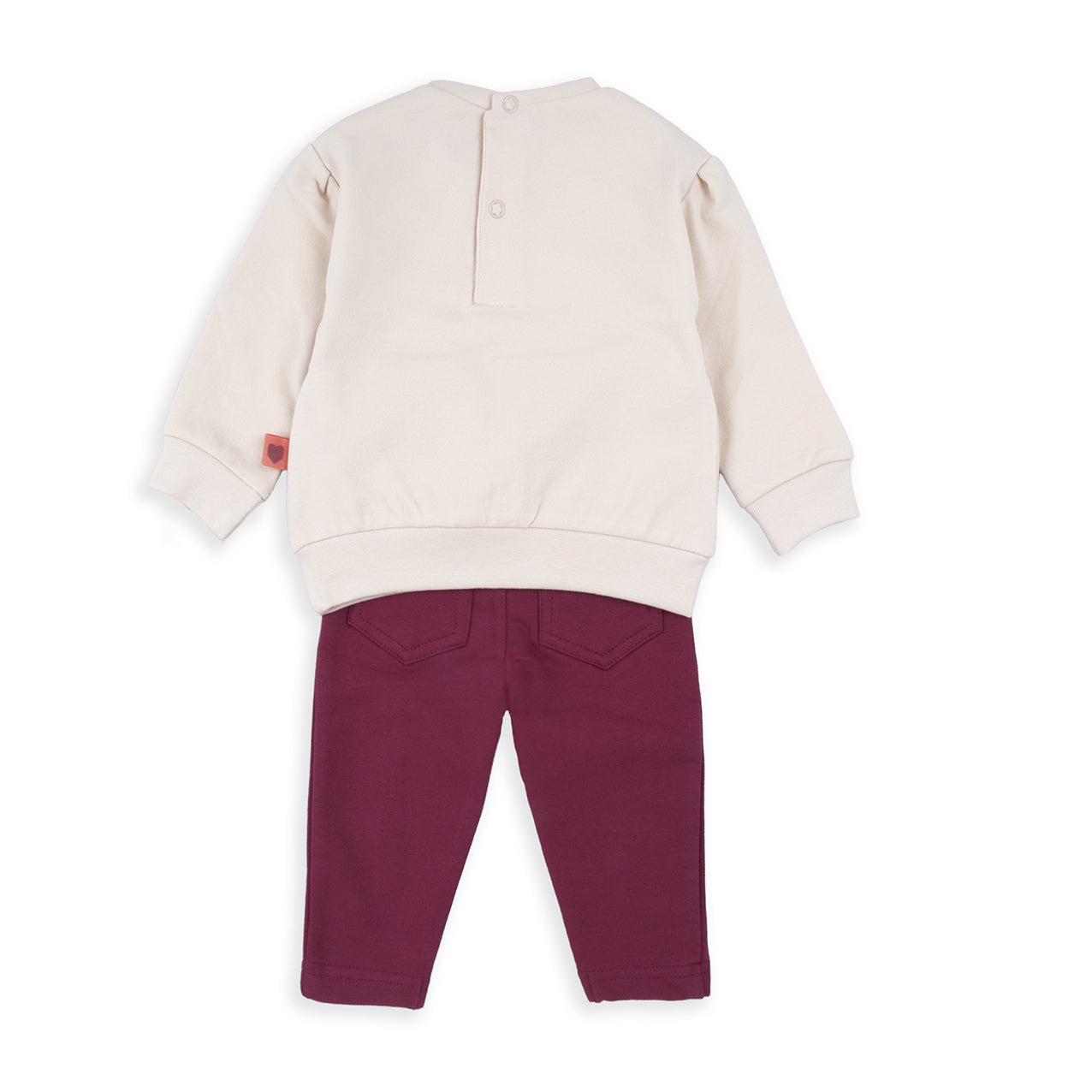 Conjunto chándal de sudadera crema con estampado y pantalón bugambilla