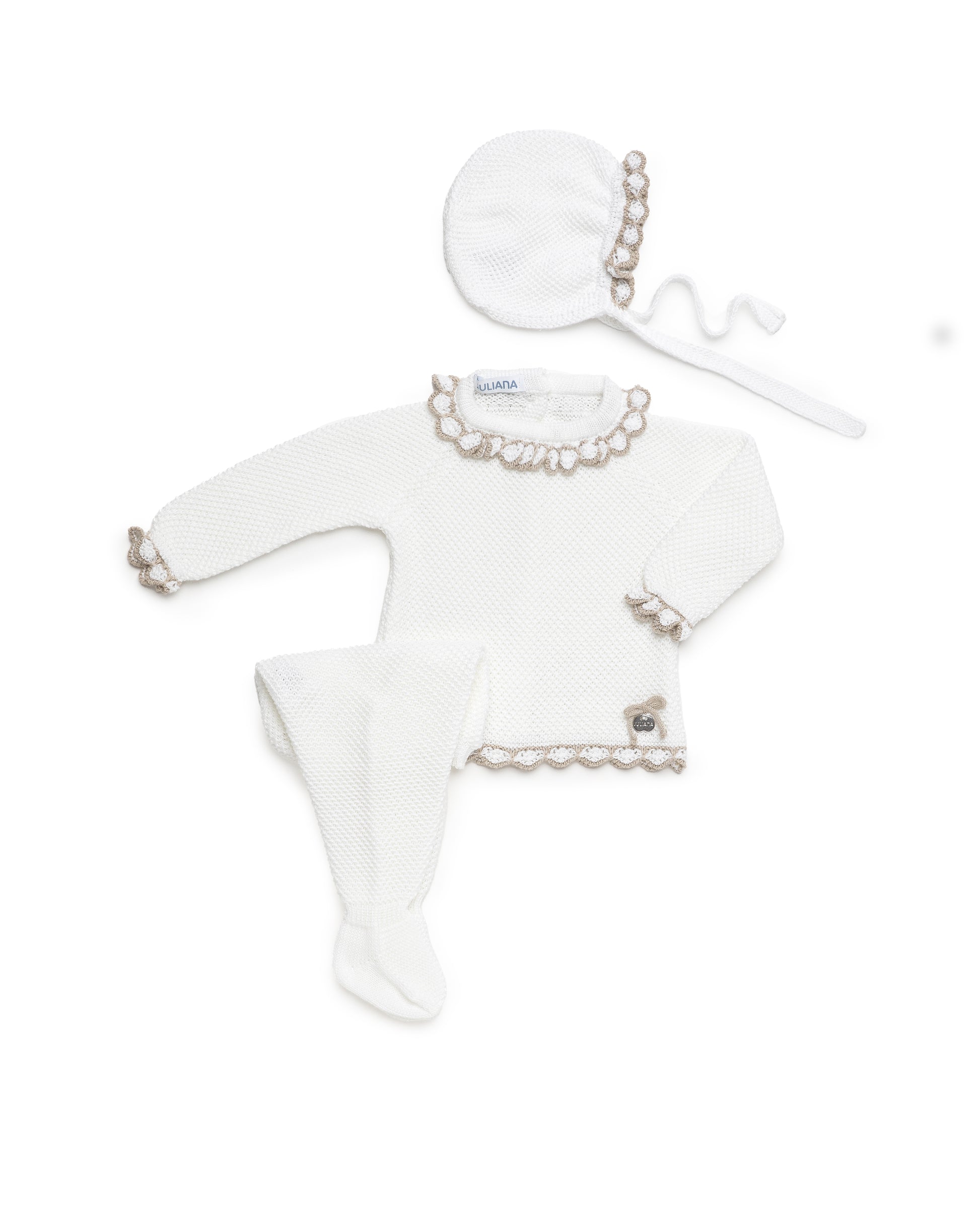 Este es un conjunto de tres piezas para bebé de la marca Juliana, diseñado con un estilo clásico, tierno y elegante. Es ideal para ocasiones especiales, como una salida del hospital o un bautizo.