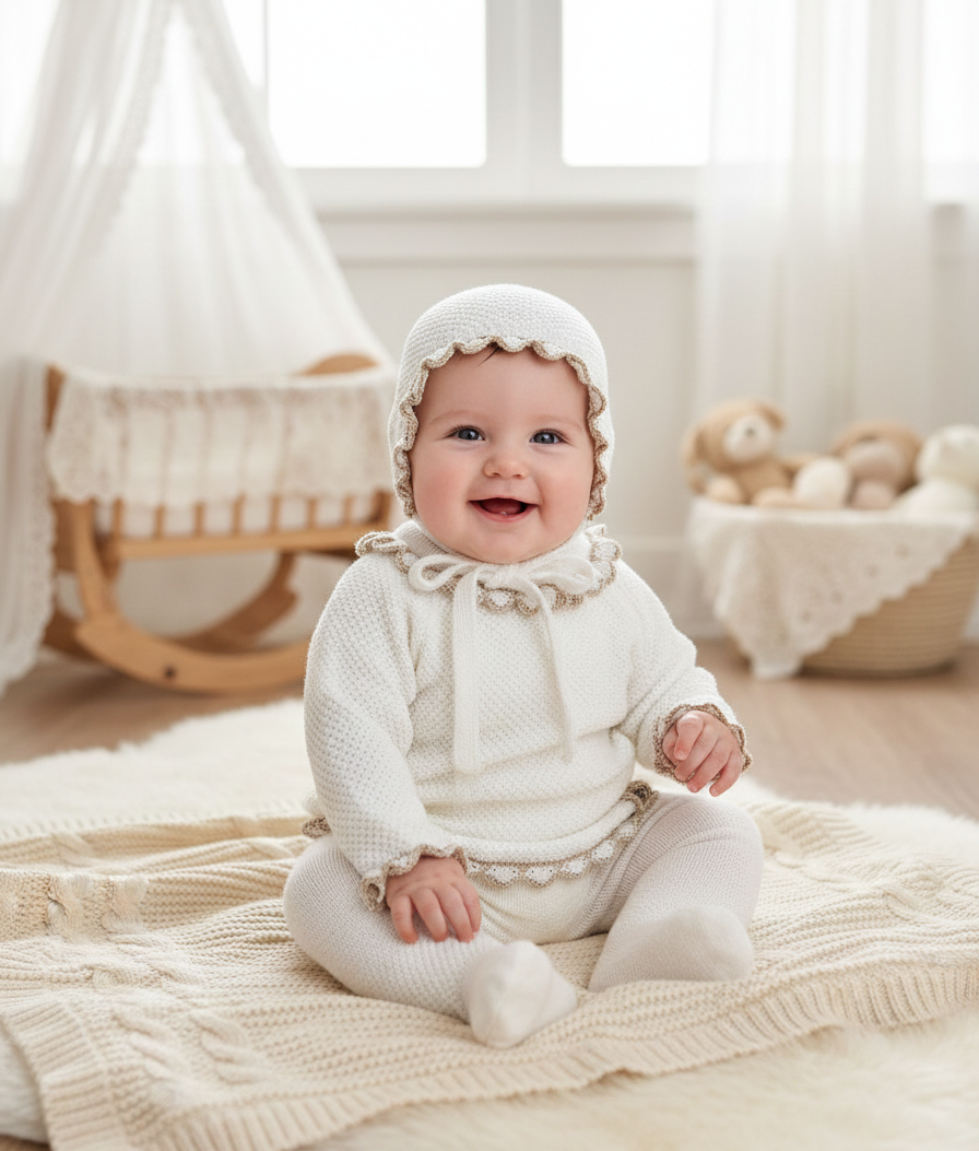 Capota (Gorrito): Un gorro de estilo clásico con cierre de cordón para atar bajo la barbilla. Cuenta con el mismo detalle de ondas festoneadas en el borde que enmarca la cara del bebé.
