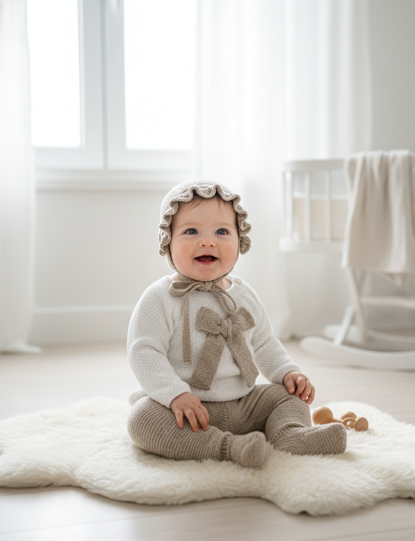 Capota a juego: Un accesorio tradicional que enmarca la cara del bebé. Está confeccionada en el mismo tono y punto que las polainas, con un borde ligeramente ondulado y tiras para anudar bajo la barbilla, asegurando que se mantenga en su sitio.