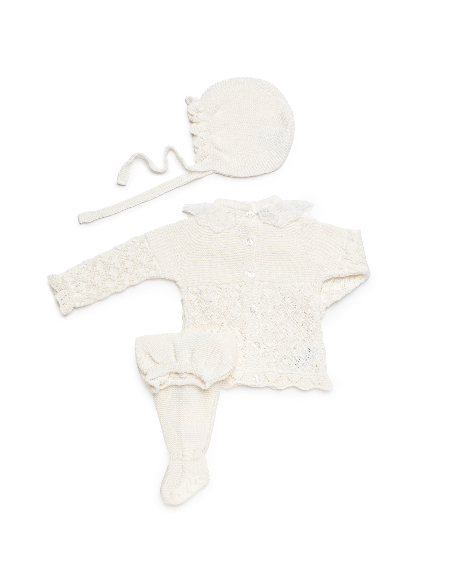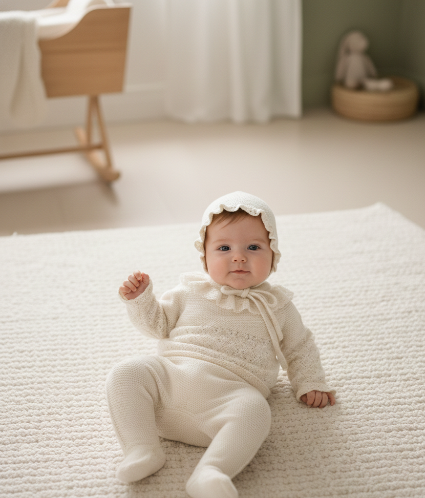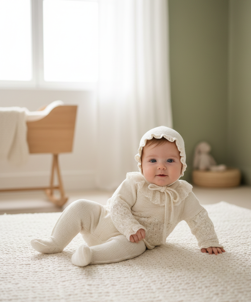 Conjunto de Punto Artesanal con Capota Envuelve a tu bebé en la suavidad de este conjunto clásico en tono crudo. Confeccionado con delicados calados y un cuello de volante fruncido, este set de tres piezas (jersey, polaina y capota a juego) es la elección perfecta para los primeros meses o una ocasión especial. Un diseño atemporal que garantiza confort y elegancia.