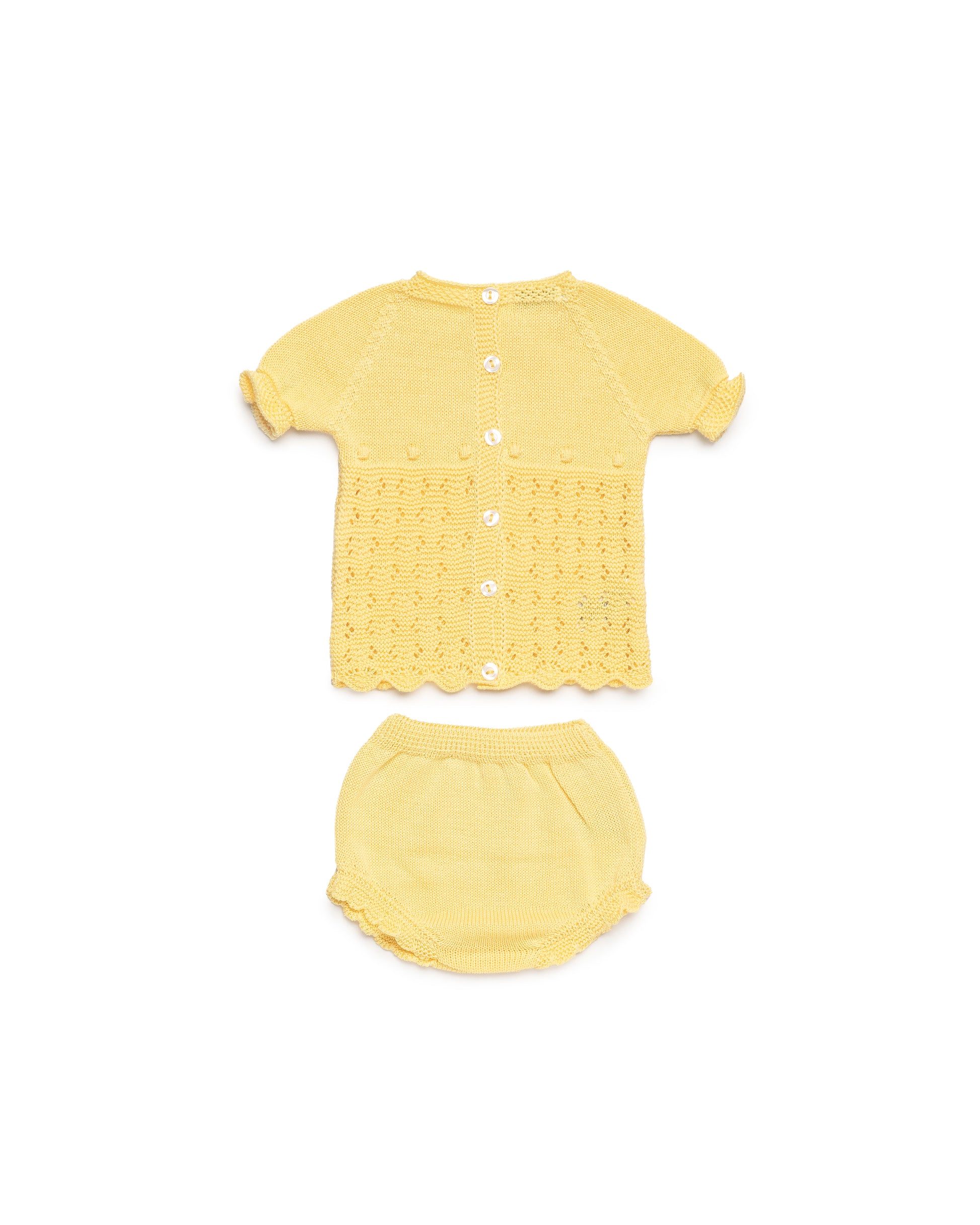 Jersey/Jubón: Presenta una manga corta con un ligero acabado de volante. Destaca un trabajado calado central en el pecho con motivos geométricos y un remate ondulado en el bajo que le da un toque muy tierno.
