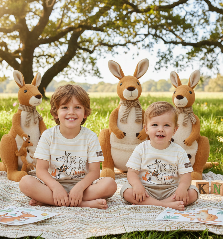 Conjunto "K is for Kangaroo" – Aventuras en la Naturaleza Viste a tus pequeños exploradores con este conjunto de dos piezas que combina comodidad y estilo. Con un diseño de rayas suaves y una ilustración artesanal de un canguro, es la prenda perfecta para días de juego al aire libre. Fabricado en algodón suave, ideal para la piel delicada de niños de todas las edades.