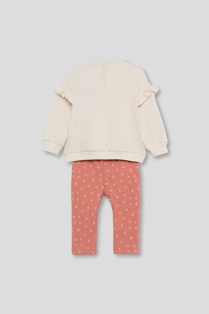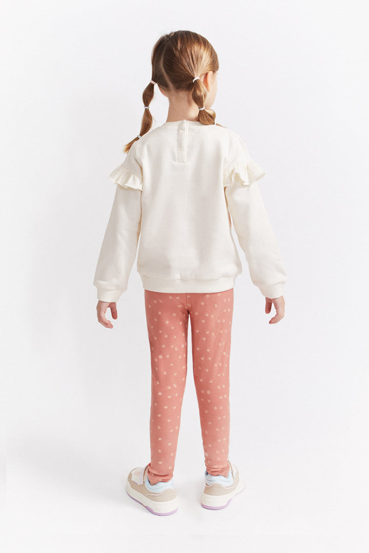 💚Conjunto de dos piezas, sudadera y leggings para niña de 6 meses a 6 años. Sudadera en color crudo con volantes decorativos en los hombros y estampado de caritas de gato en los laterales, acompañados del texto “mini cat” bordado en el pecho. Cuello redondo, puños y bajo con acabado elástico para mayor comodidad. Se combina con leggings en color maquillaje con estampado de pequeños lunares en tono maquillaje claro, y cinturilla elástica para un ajuste perfecto. Confeccionado en felpa cálida y suave, ideal para el invierno.💚
