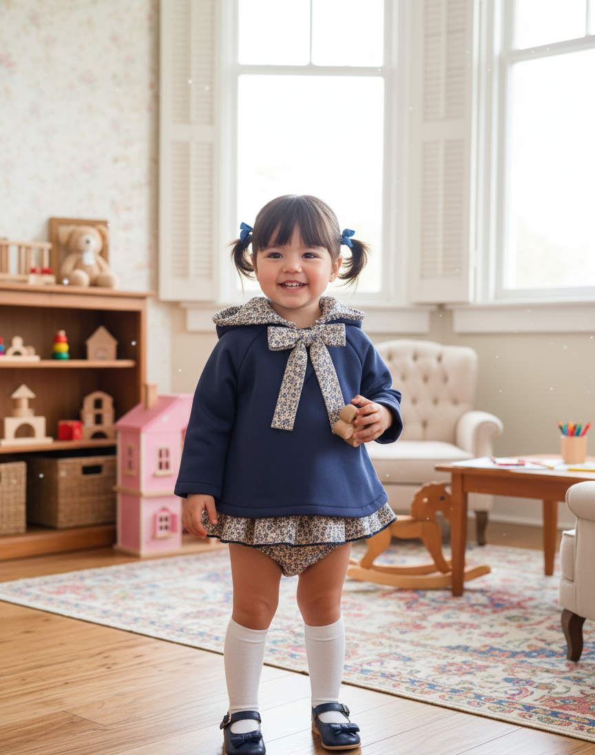 El conjunto de la imagen es un outfit infantil muy tierno y elegante. Está compuesto por una sudadera de manga larga en color azul marino, con detalles en tela estampada de pequeñas flores en tonos azul y beige.