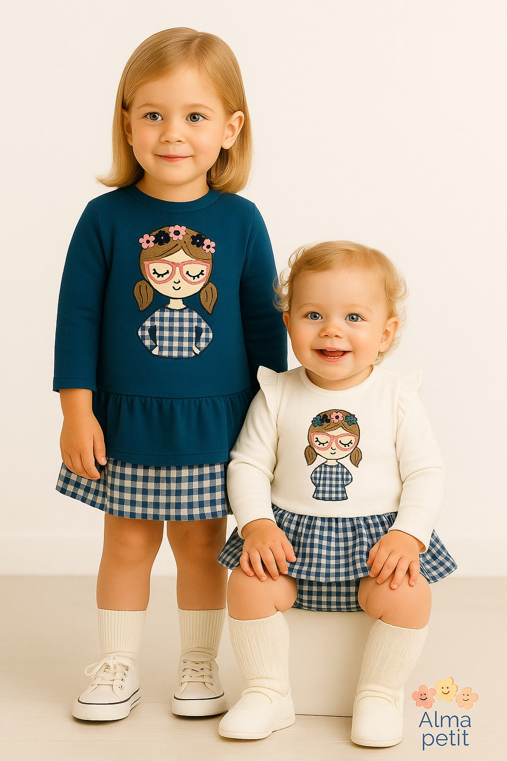 Vestido de algodón en blanco roto con volantes en los hombros con volante de cuadros vichi en blanco y azul , bordado de muñeca, braguita de popelin de cuadros vichi con goma en la cintura y en las piernas.