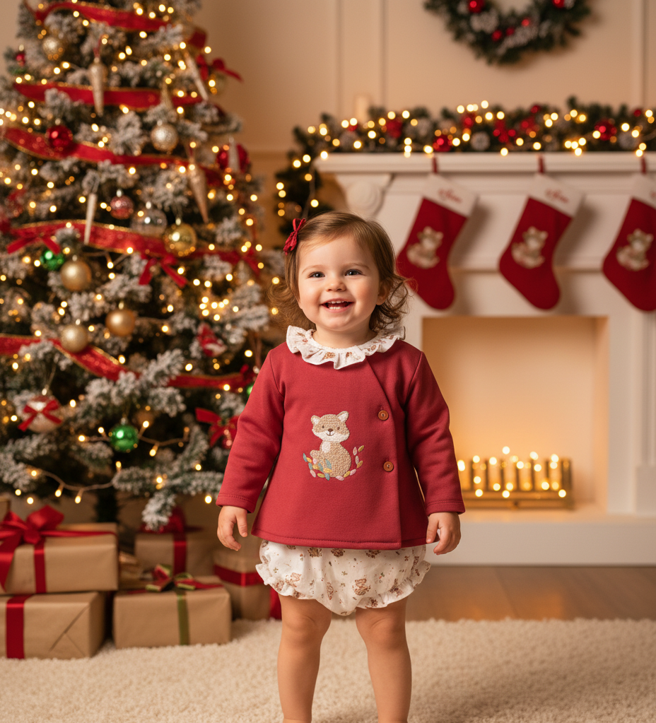 🌿Conjunto infantil compuesto por una sudadera tipo chaqueta en tono terracota con delicado bordado de zorrito y hojas de colores al frente. Lleva botones decorativos en el costado y cuello volante estampado con pequeños zorros, que le da un toque dulce y elegante. Se complementa con un pololo (braguita) de algodón blanco estampado con mini zorritos y detalles florales. Ideal para mantener a tu bebé cómodo y con estilo en cualquier ocasión.✨