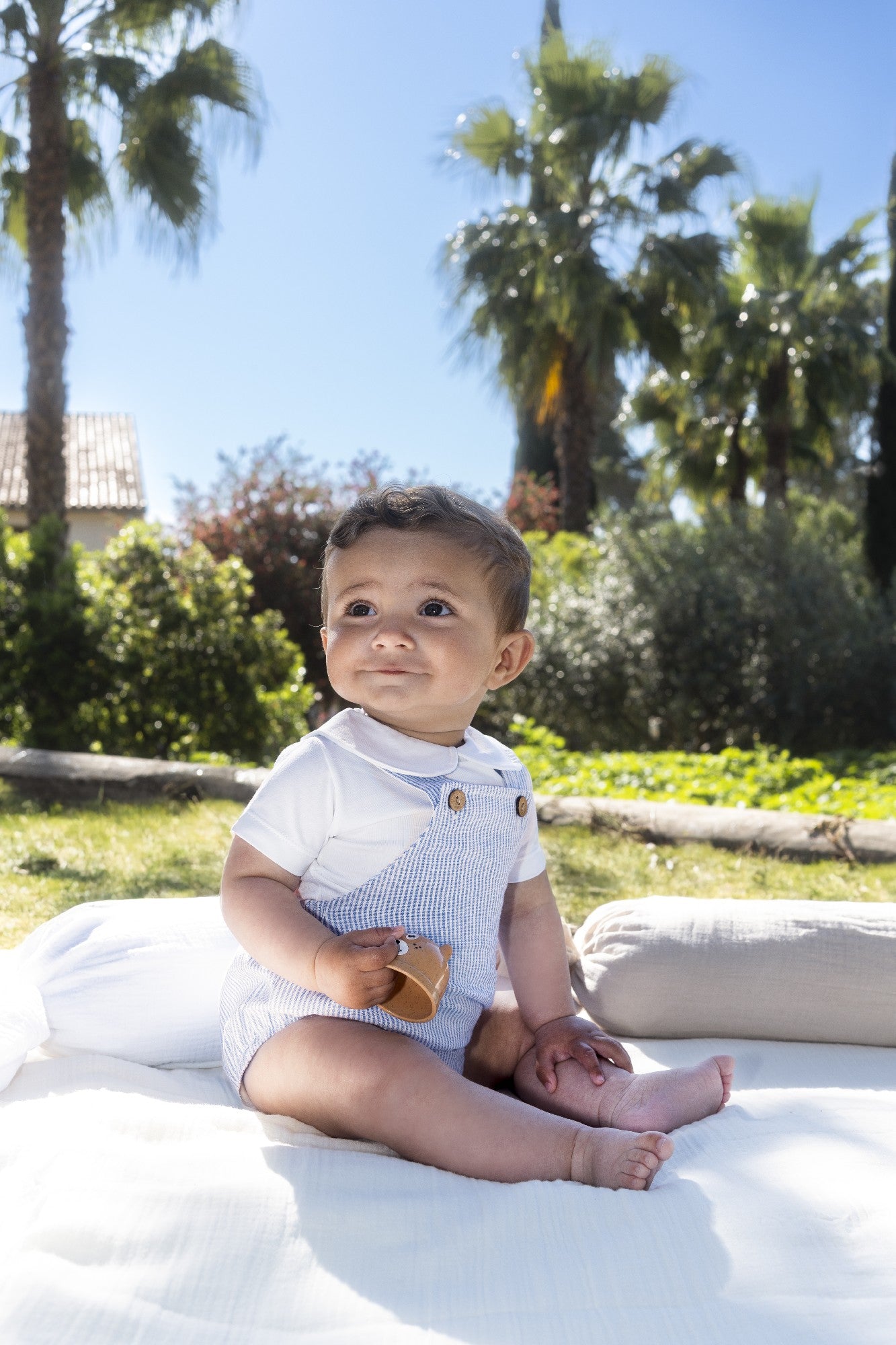 Este conjunto combina la textura clásica del bordado blanco con la frescura de las rayas marineras. Es una opción atemporal y versátil que funciona perfectamente tanto con sandalias de cuero como con zapatillas de lona blancas.