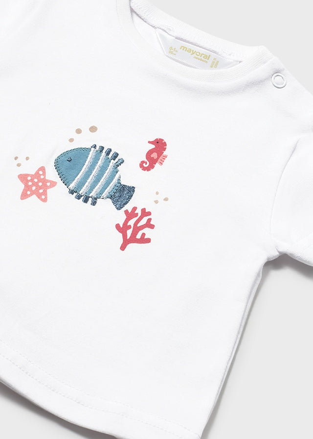 Este es un conjunto infantil de tres piezas de la marca Mayoral, diseñado con una temática marina encantadora y refrescante, ideal para días de sol o paseos por la playa.