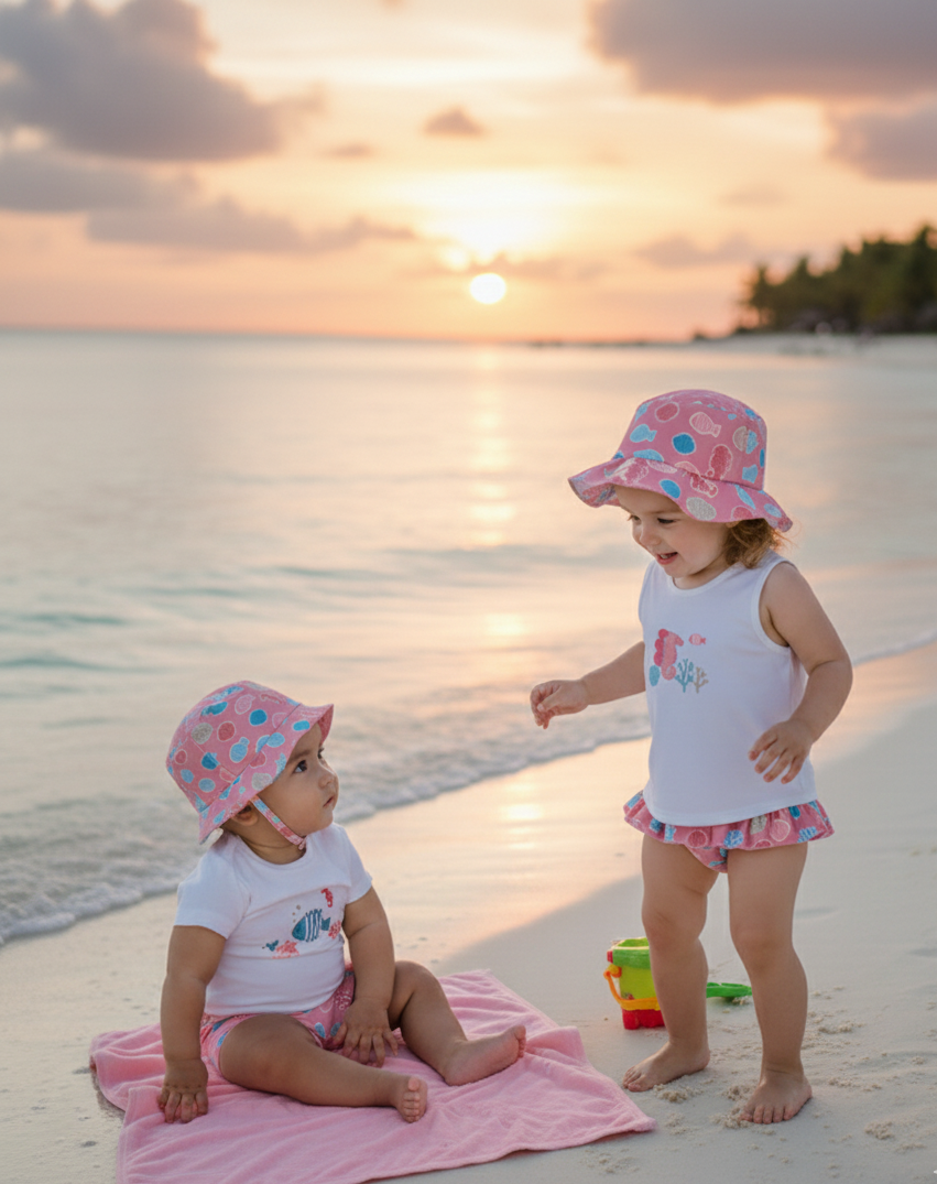 Resumen de estilo: Es un conjunto coordinado, práctico y veraniego. La combinación del blanco con los tonos pasteles y el azul crea un look limpio y alegre, mientras que los materiales parecen ser de algodón suave y tejidos aptos para el agua.