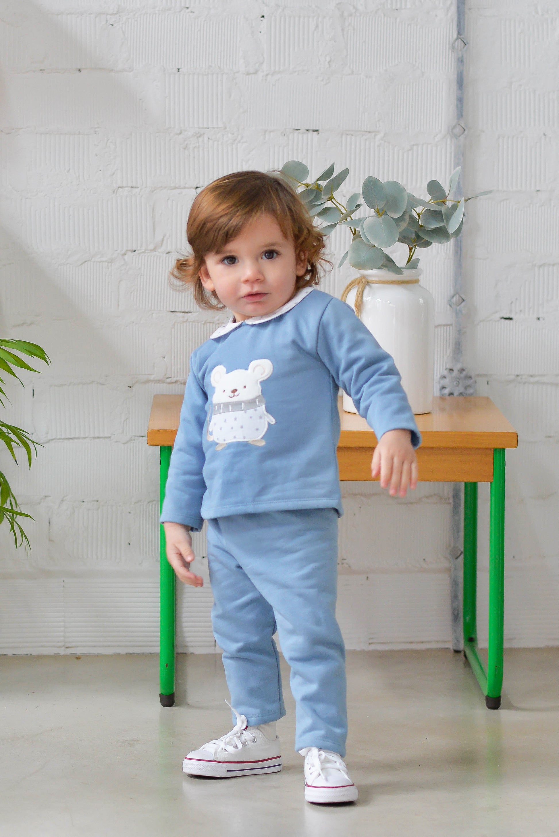 Conjunto de bebé de dos piezas en color azul indigo. Incluye blusa con volantes estampados en cuello y blusa, y detalle de ovejita al frente. Pantalón a juego, cómodo y suave al tacto. Ideal para el día a día con estilo y ternura.