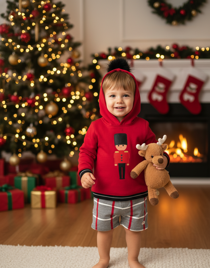 Conjunto sudadera roja con cascanueces, la capucha terminada en pico con pompón desmontable de pelo negro y pantalón corto gris a cuadros (lleva elásticos por detrás de los muslos, tipo bombacho).