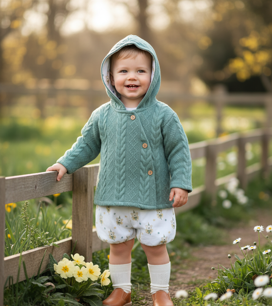 🌿Conjunto para bebé compuesto por una sudadera en suave lana color verde agua y pololo dulce de animalitos y estrellas. la sudadera un diseño trenzado en la parte delantera y botones de madera para un toque clásico y elegante. la sudadera tiene apertura delantera de botones con capucha