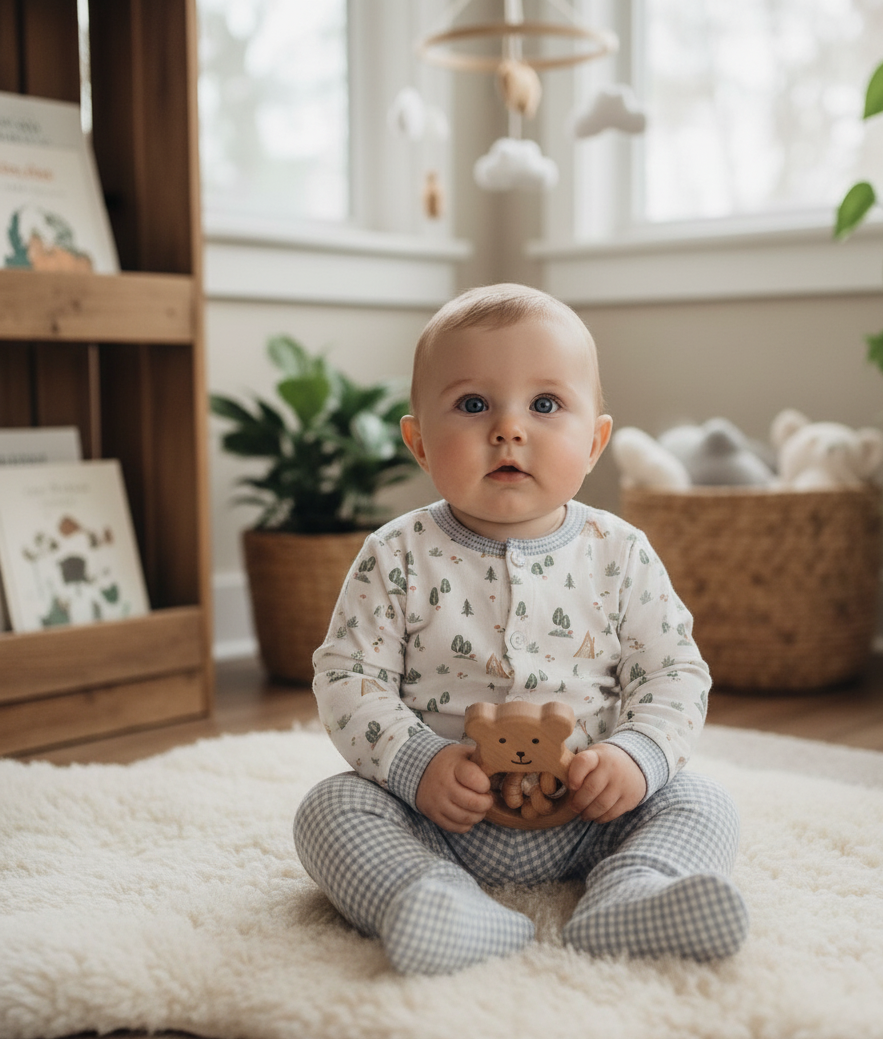 En tejido 100% Algodón de alta calidad, muy suave y pensado para la delicada piel del bebé.