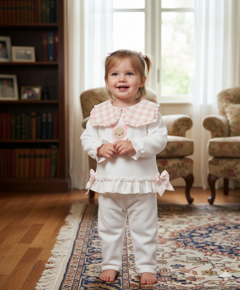 En el centro del pecho tiene un bordado de osito en tonos rosa y beige.