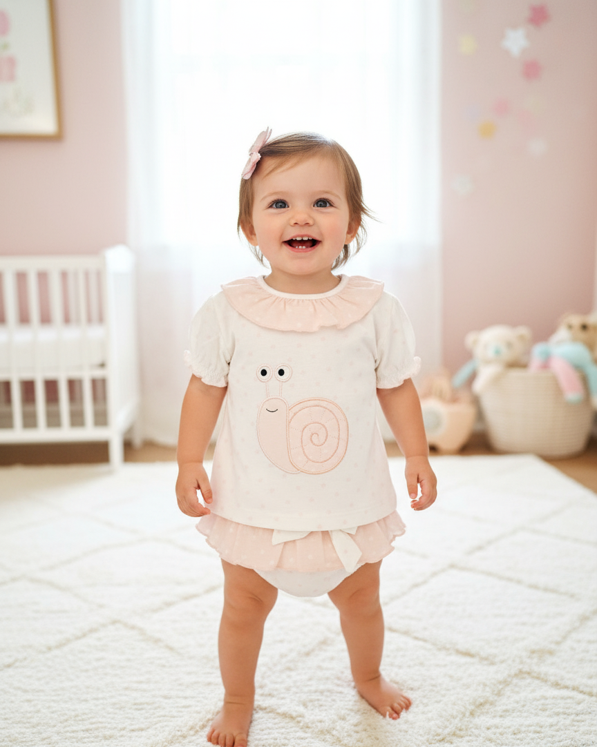 🪷 Conjunto de camiseta con braguita en crema con estrellas salmón y y camiseta con caracol volante en el cuello, embárcate